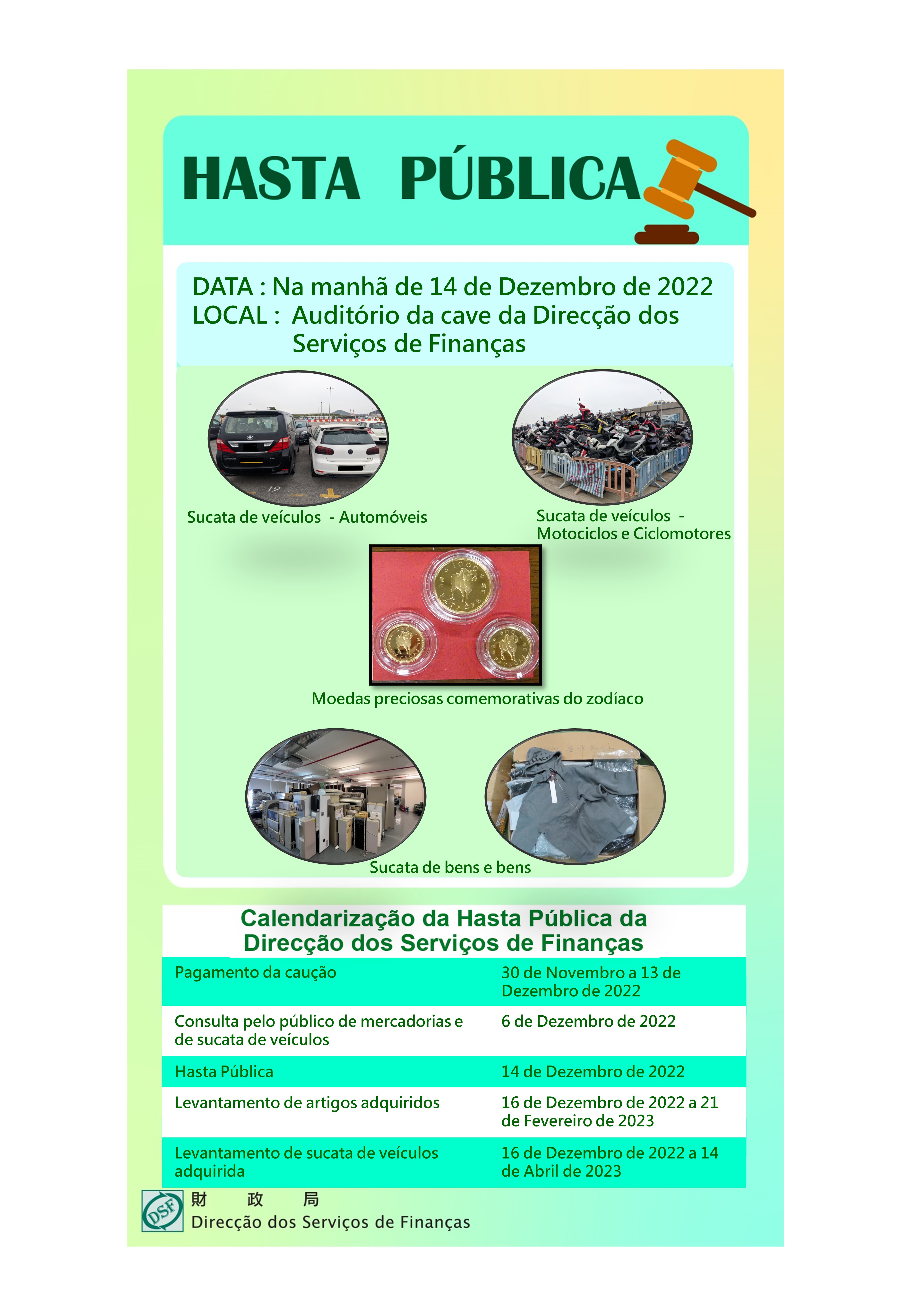 A Direcção dos Serviços de Finanças (DSF) vai realizar, em 14 de Dezembro, às 10 horas da manhã, no auditório, sito na cave da DSF, a hasta pública de todos os artigos revertidos a favor da RAEM, incluindo roupas e moedas comemorativas do ano novo lunar preciosas, contando ainda com algumas sucatas resultantes de veículos, de sucata de bens e de bens, que foram abatidos mas que são propriedade da RAEM.