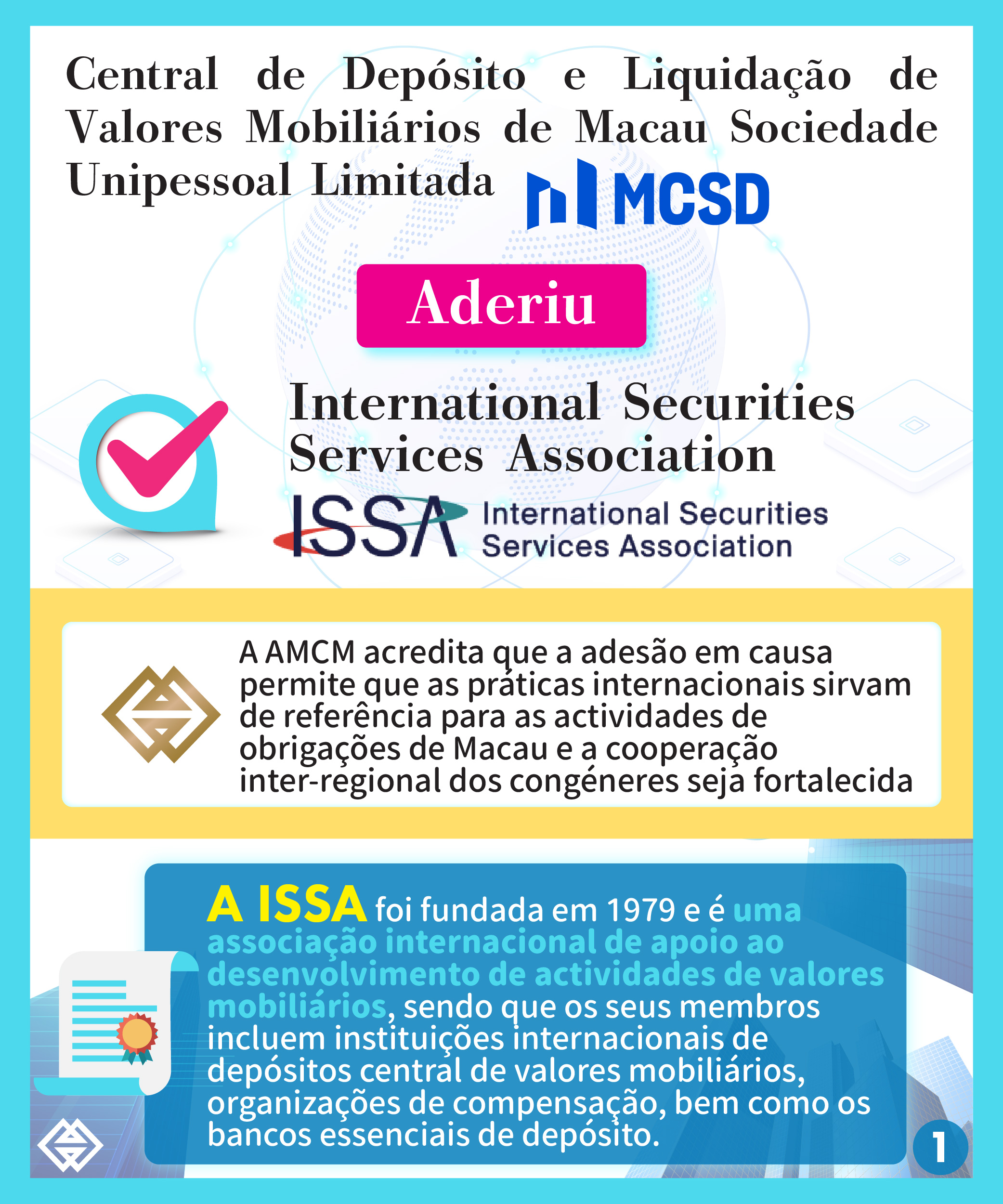 A ISSA foi fundada em 1979 e é uma associação internacional de apoio ao desenvolvimento de actividades de valores mobiliários, sendo que os seus membros incluem instituições internacionais de depósitos central de valores mobiliários, organizações de compensação, bem como os bancos essenciais de custódia. Na sua página electrónica, a ISSA endereçou os seus votos de boas-vindas relativas à adesão da MCSD (https://issanet.org/new-issa-member-macao-csd/), a AMCM acredita que a adesão da MCSD à ISSA possibilita reforçar a ligação de Macau com as instituições participantes nos mercados internacionais de valores mobiliários, promovendo o intercâmbio e a partilha de experiências.