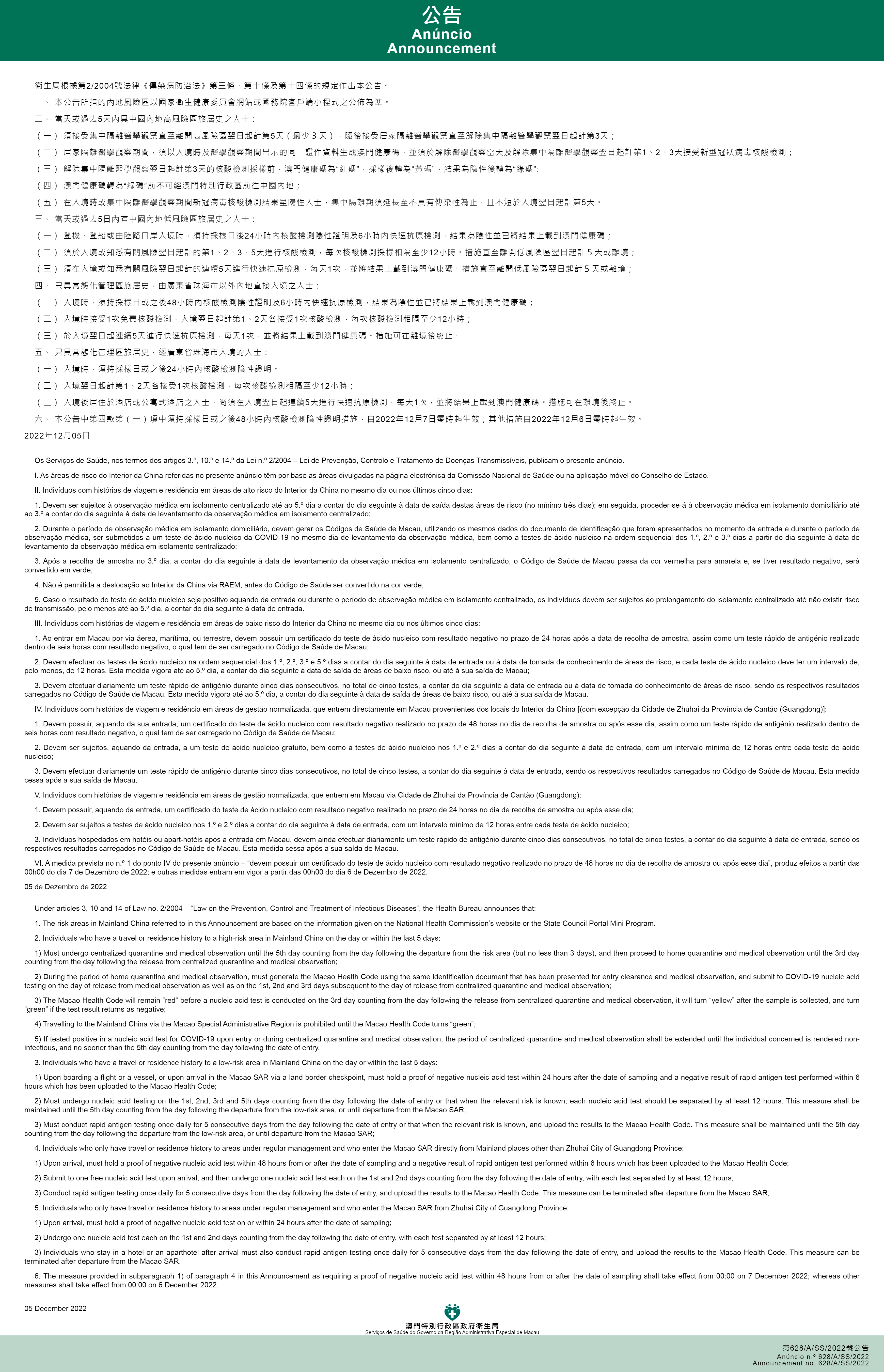 Os Serviços de Saúde, nos termos do disposto nos artigos 3.º, 10.º e 14.º da Lei n.º 2/2004 (Lei de prevenção, controlo e tratamento de doenças transmissíveis), determinam a publicação do Anúncio n.º 628/A/SS/2022. A partir das 00h00 do dia 6 de Dezembro, as medidas antiepidémicas para pessoas com história de viagem em diferentes áreas de risco do Interior da China, que pretendem entrar em Macau ou tenham entrado em Macau (incluindo residentes e não residentes de Macau), serão ajustadas da seguinte forma: