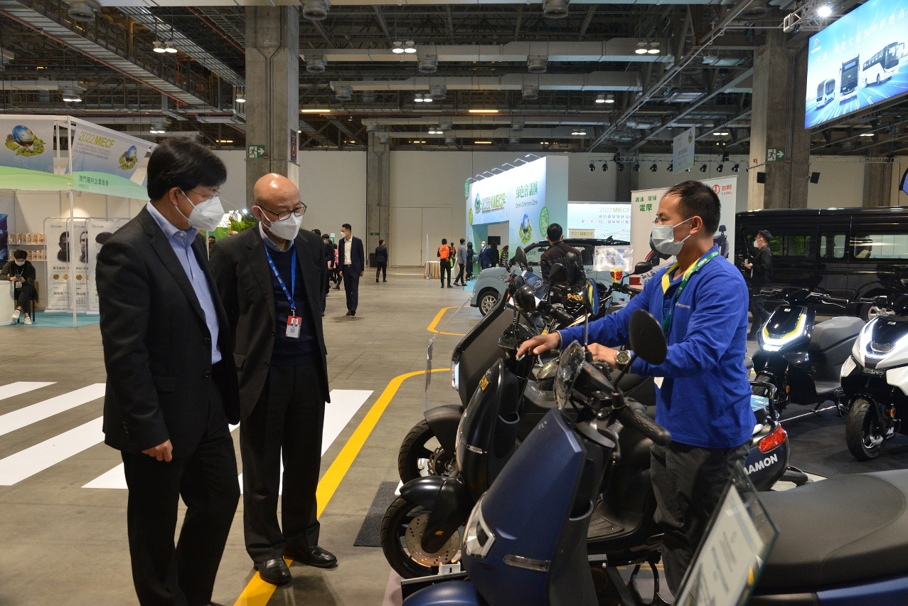 A “Zona de Exposição de Mobilidade Ecológica” do MIECF do corrente ano teve elementos mais enriquecidos comparativamente com o ano anterior, exibindo diversos automóveis e motocicletas eléctricos (superior a 30 marcas) bem como equipamentos de apoio e tecnologias relevantes respeitantes ao carregamento de electricidade e à troca das baterias, e também muitas marcas procederam ao lançamento de novos produtos, possibilitando a experiência de condução, a título experimental, de motocicletas eléctricas e aumentando, assim, o conhecimento dos visitantes e do público sobre veículos eléctricos, por forma a melhor agir com as políticas do passeio ecológico e da dupla meta de carbono. No percurso da exposição, o director da DSPA e outra pessoa trocaram ideias com as indústrias participantes para ouvir as suas opiniões e, no futuro, irá continuar a melhorar as políticas de promoção em questão.