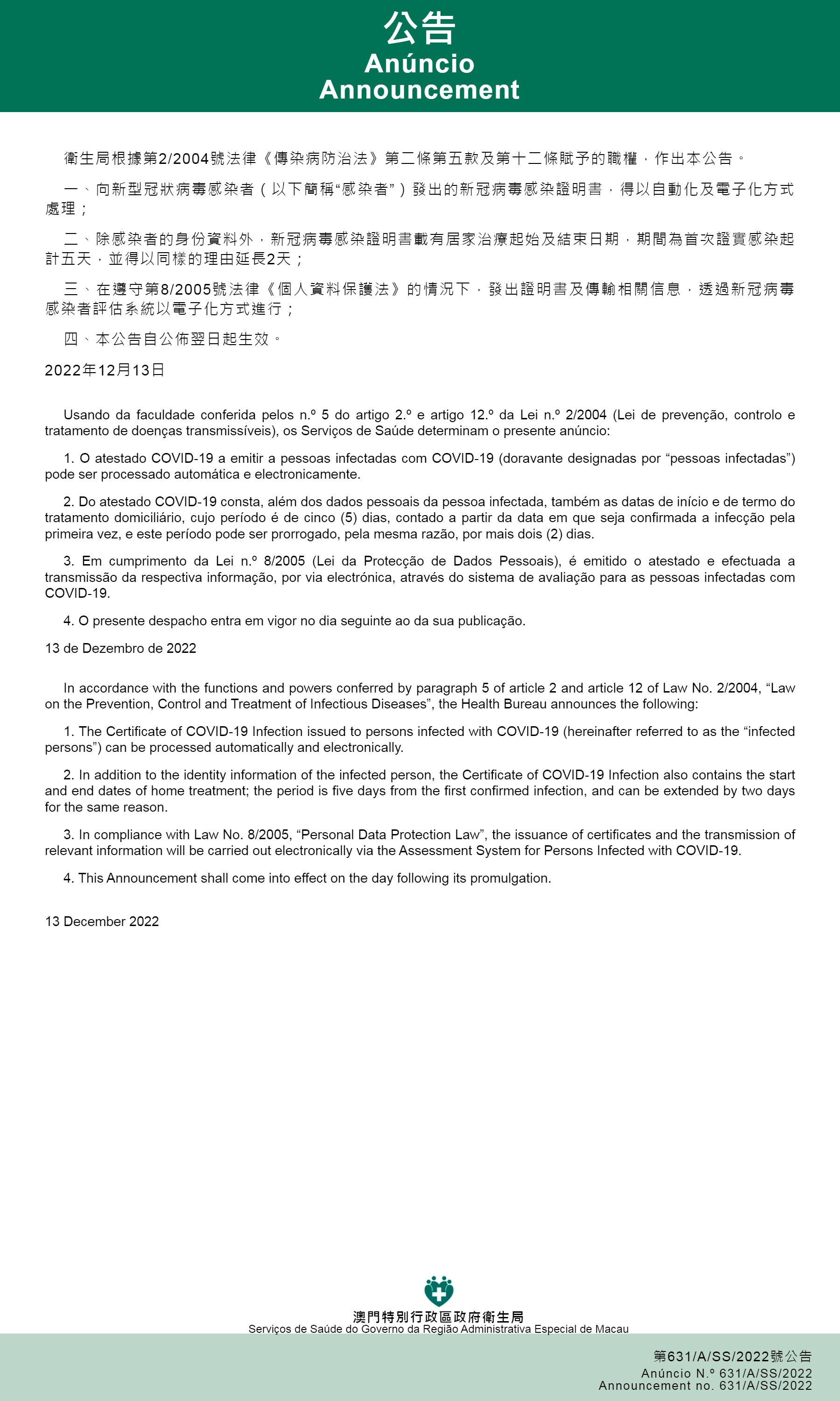 Durante o período de transição de prevenção e controlo da epidemia, estima-se um grande número de pessoas infectadas com o novo tipo de coronavírus (doravante denominadas “pessoas infectadas”) num curto período de tempo e a maioria das pessoas infectadas pode recuperar em casa. Com o objectivo de evitar que as pessoas infectadas recorram aos médicos para obter meramente um atestado médico, o que pode causar uma procura acrescida de serviços médicos e prejudicar os indivíduos que têm necessidade efectiva de serviços médicos, os Serviços de Saúde publicaram o Despacho n.º 631/A/SS/2022 hoje (terça-feira, dia 13) para regulamentar a emissão do “Atestado COVID-19” de forma automática e electrónica às pessoas infectadas.