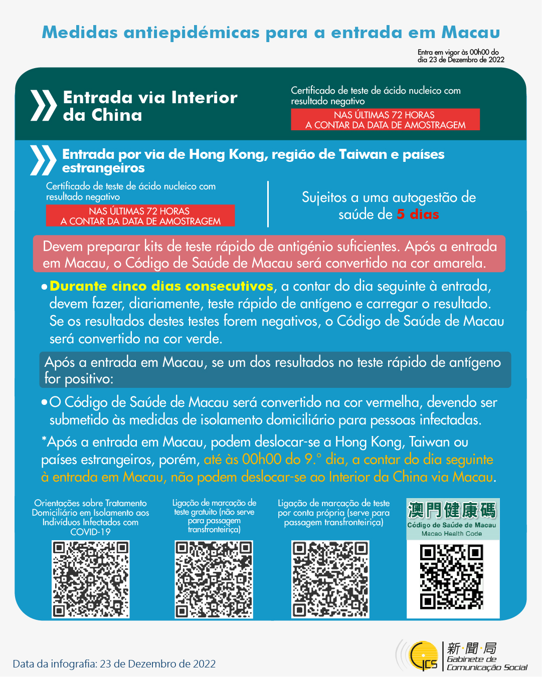 (Infografia) Medidas antiepidémicas para a entrada em Macau (23 de Dezembro de 2022).