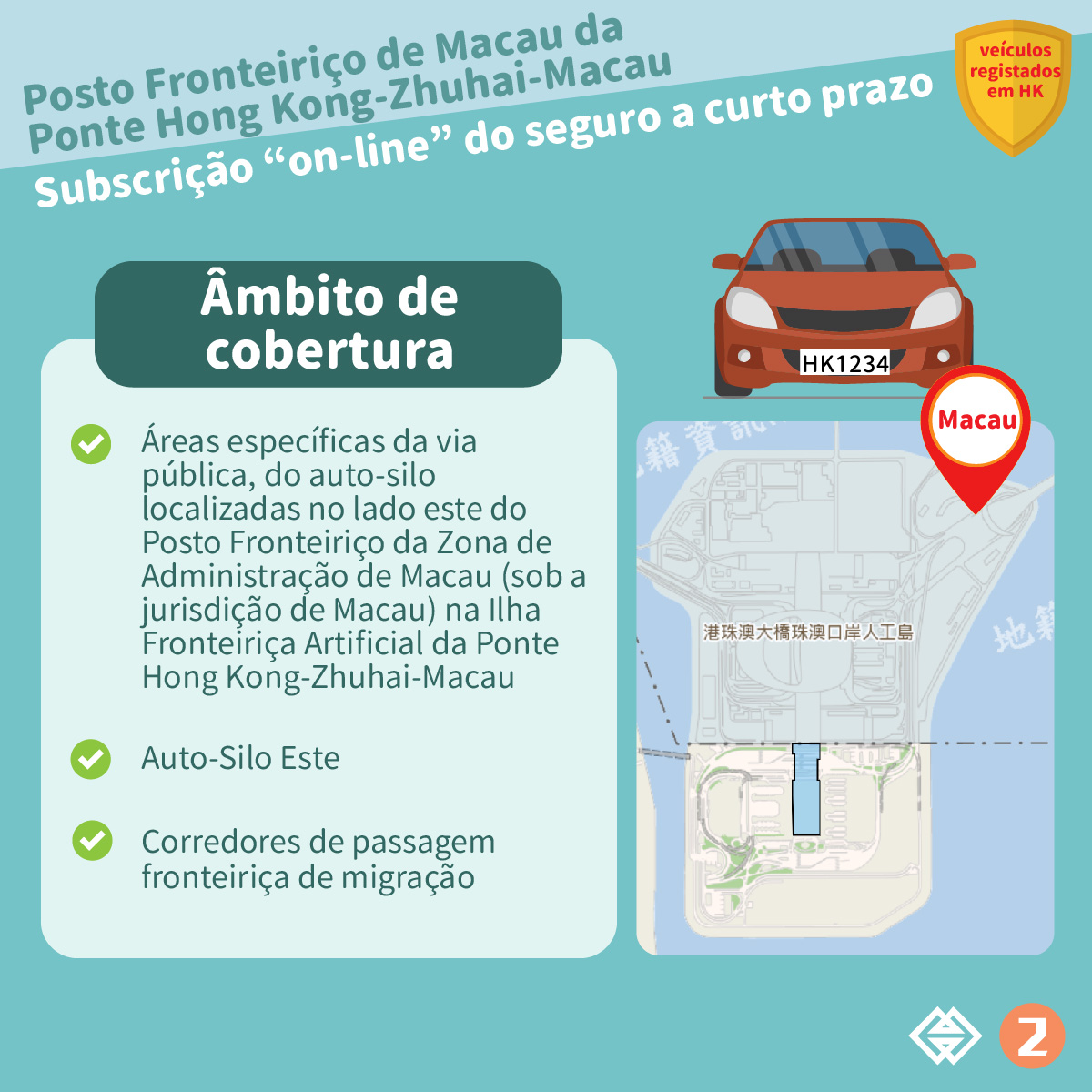 Os veículos registados em Hong Kong que circulam, de acordo com o «Regulamento de Utilização e Exploração do Auto-Silo Este do Posto Fronteiriço da Ponte Hong Kong-Zhuhai-Macau », nas áreas específicas da via pública, no auto-silo e nos corredores de passagem fronteiriça de migração, localizados no lado este do Posto Fronteiriço da Zona de Administração de Macau (sob a jurisdição de Macau) na Ilha Fronteiriça Artificial da Ponte Hong Kong-Zhuhai-Macau podem subscrever o seguro a curto prazo, de modo a obter cobertura para danos causados a terceiros ou responsabilidade civil de danos causados.