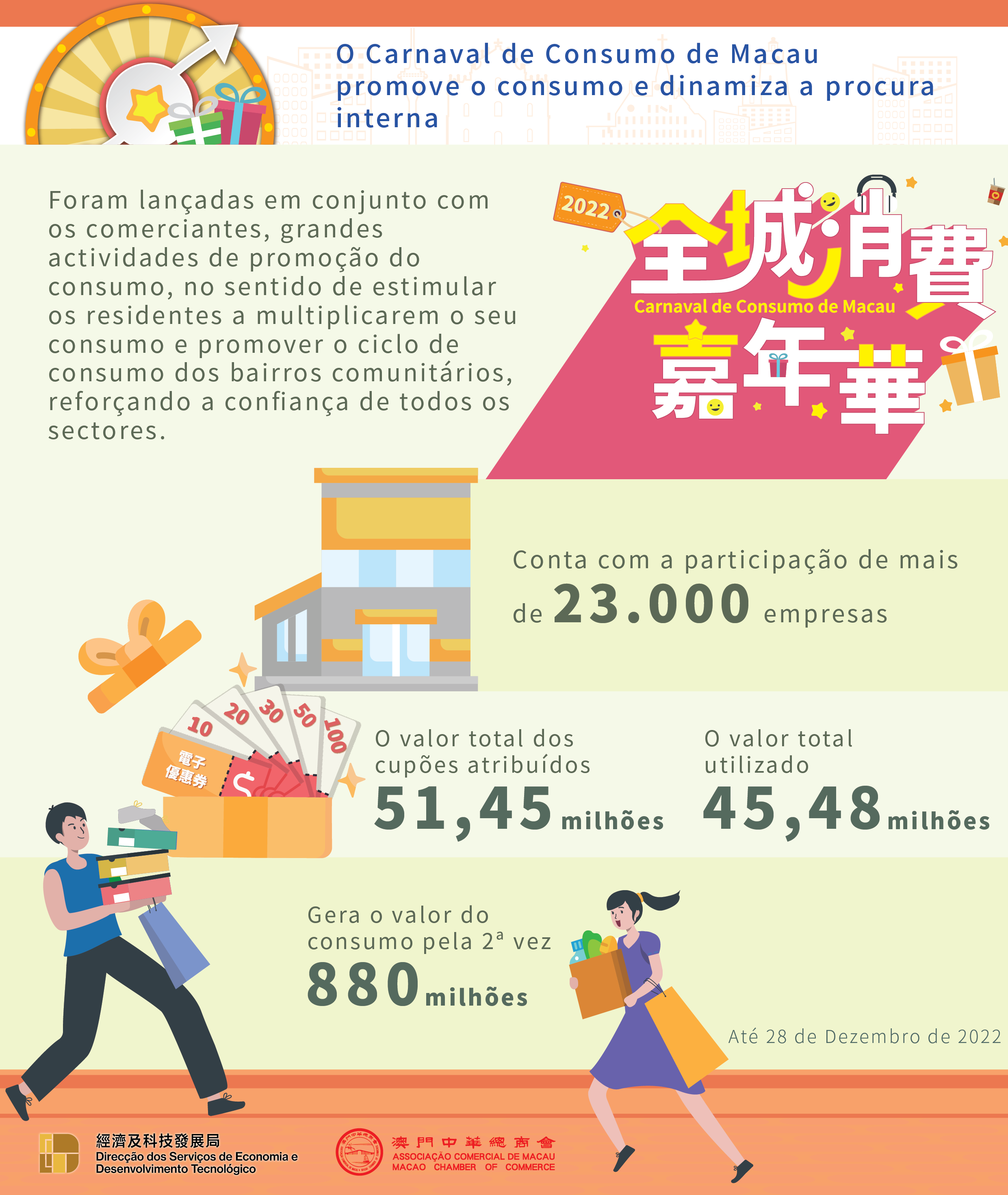Para promover a recuperação económica após epidemia e dinamizar o ambiente do mercado, a Direcção dos Serviços de Economia e Desenvolvimento Tecnológico (DSEDT) e a Associação Comercial de Macau organizaram, em conjunto, uma grande actividade de promoção do consumo denominada Carnaval de Consumo de Macau 2022, que decorre entre 15 de Outubro de 2022 e 28 de Fevereiro de 2023, com a duração de mais de 4 meses.