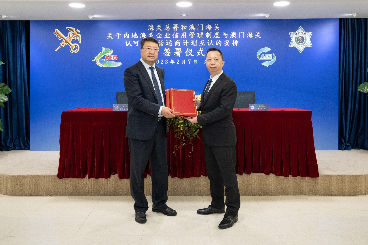 No dia 7 deste mês, o Subdirector da Administração Geral das Alfândegas da República Popular da China, Sun Yuning, e o Director-geral dos Serviços de Alfândega, Vong Man Chong, assinaram conjuntamente o "Acordo entre a Administração Geral das Alfândegas da República Popular da China e os Serviços de Alfândega da RAEM (SA) sobre o Reconhecimento Mútuo do Sistema de Gestão de Crédito Empresarial da Alfândega do Interior da China e do Programa Operador Económico Autorizado dos Serviços de Alfândega da RAEM" (doravante denominado por "Acordo de Reconhecimento Mútuo"), para implementar medidas de desalfandegamento para as Alfândegas do Interior da China e para os SA, de modo a facilitar o desalfandegamento das empresas de alto crédito reconhecidas entre si. A assinatura do "Acordo de Reconhecimento Mútuo" ajudará a aumentar a competitividade das empresas de Macau, promoverá a segurança comercial e a facilitação da passagem fronteiriça na Zona de Cooperação Aprofundada entre Guangdong e Macau em Hengqin, bem como criará condições favoráveis para o lançamento local do programa Operador Económico Autorizado (Authorized Economic Operator, doravante denominado AEO).