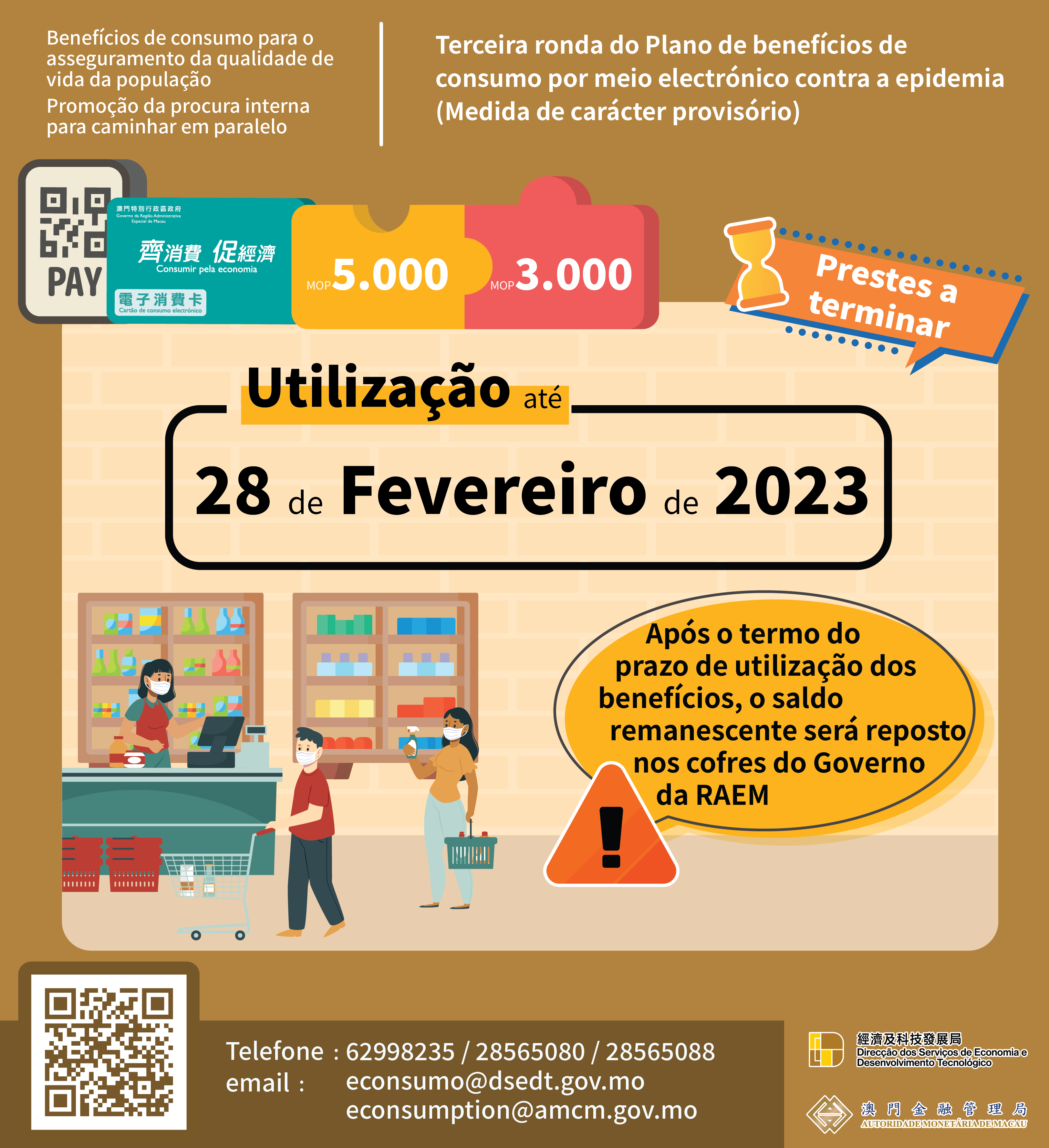 O prazo de utilização dos benefícios (incluindo o montante inicial e o montante para desconto imediato) no âmbito da “Terceira ronda do Plano de benefícios de consumo por meio electrónico contra a epidemia” terminará no dia 28 de Fevereiro de 2023, pelo que o Governo da RAEM apela aos residentes que tenham recebido os benefícios para os utilizarem atempadamente, sendo o saldo remanescente não utilizado no prazo fixado resposto nos cofres do Tesouro.