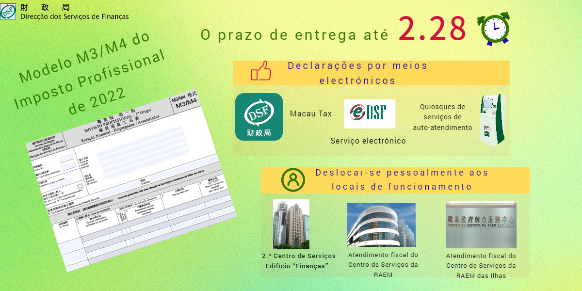 O prazo de entrega do modelo M3/M4 do Imposto Profissional do 1.º Grupo (Relação Nominal - Empregados ou Assalariados) vai até 28 de Fevereiro. Os contribuintes independentemente de terem ou não recrutado trabalhadores, ou os estabelecimentos comerciais quer estejam ou não em actividade, devem efectuar a entrega do referido modelo dentro do prazo legal indicado. A prestação de declarações falsas ou a entrega fora do prazo estão sujeitas à aplicação de multa.