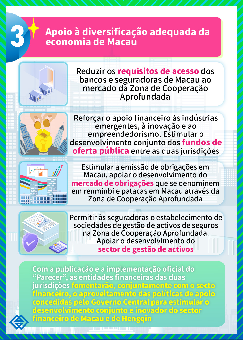 No “Parecer”, são apresentadas as medidas respeitantes à redução das restrições de acesso às instituições financeiras com capital de Macau no estabelecimento das suas actividades na Zona de Cooperação Aprofundada e ao desenvolvimento da indústria financeira moderna na Zona. Paralelamente, o “Parecer” estimula a criação de diferentes tipos de instituições financeiras na Zona, por forma a prestar serviços financeiros diversificados e globais às indústrias principais nas áreas da cultura, turismo, comércio, convenções e exposições, de modo a reforçar o papel do sector financeiro na prestação de apoio à economia real, contribuindo desta forma para o desenvolvimento da diversificação adequada da economia de Macau.