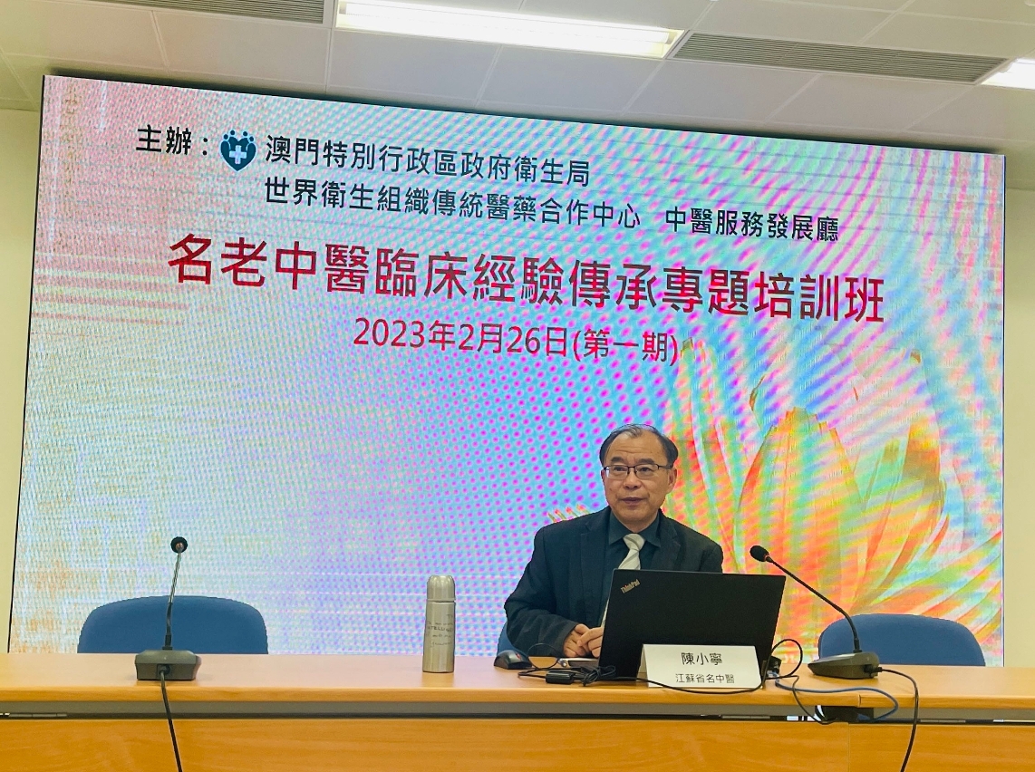 Recentemente, decorreu online a 1ª “Formação temática sobre a transmissão de experiências clínicas por médicos reconhecidos da medicina tradicional chinesa de 2023”, iniciativa organizada pelo Centro de Cooperação de Medicina Tradicional da OMS (Macau) em conjunto com o Departamento de Desenvolvimento dos Serviços de Medicina Tradicional Chinesa e unidades subordinadas aos Serviços de Saúde do Governo da Região Administrativa Especial de Macau. Nesta formação, o conceituado especialista de medicina tradicional chinesa (MTC) do Interior da China: Dr. Chen Xiaoning, médico famoso de MTC da Província de Jiangsu, foi convidado para realizar uma palestra temática sobre os “Cuidados de saúde para sequelas causadas pela COVID-19, por meio da MTC”.