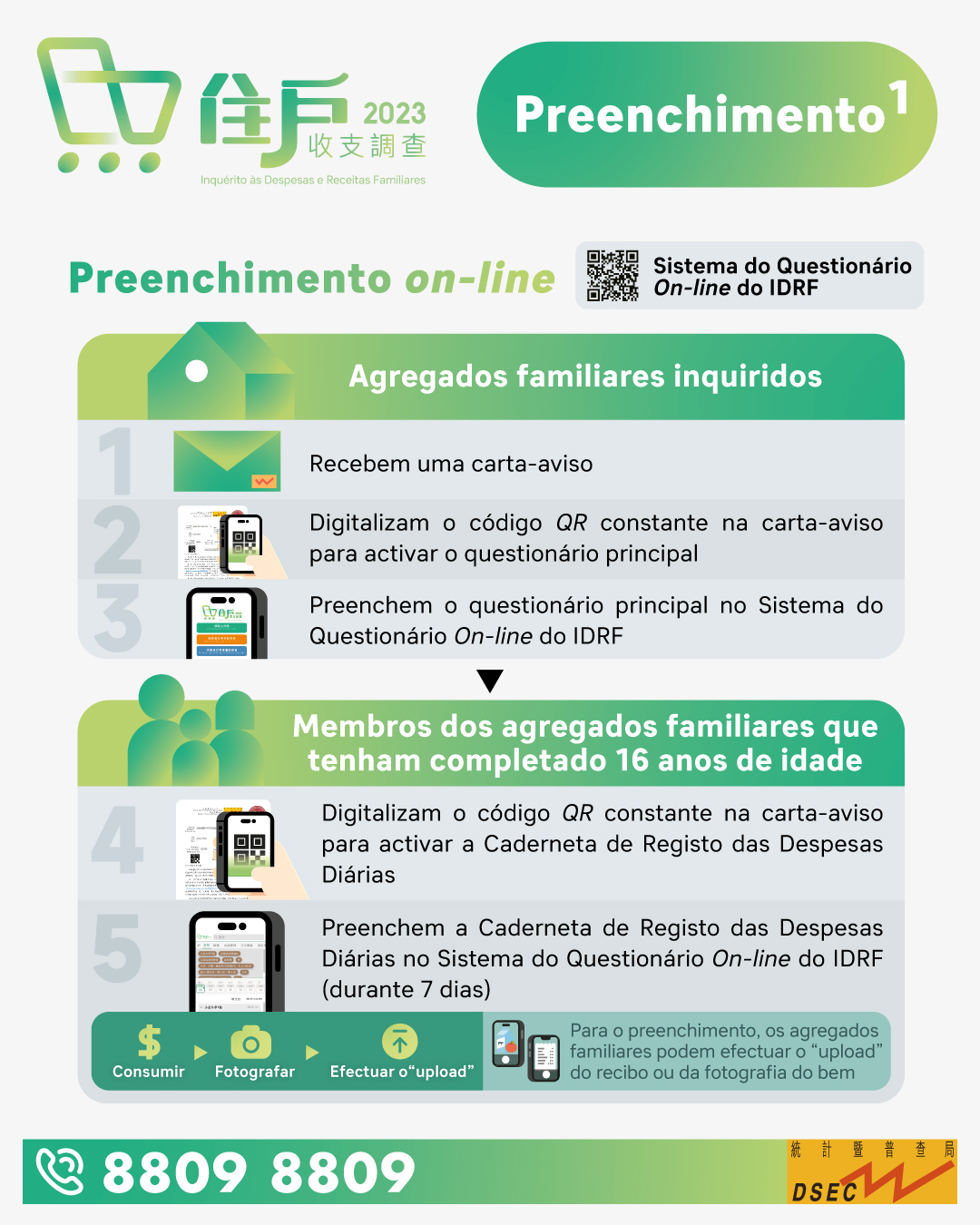 Os agregados familiares também podem ligar para a linha azul 8809 8809, a fim de marcar uma entrevista, na qual o entrevistador visitará os agregados para recolher informações. O entrevistador usará um uniforme azul escuro com o logotipo da DSEC e terá uma pasta cinzenta. Aquando da visita, o entrevistador mostrará ao agregado familiar o seu cartão de identificação e confirmará o endereço do agregado. Caso seja necessário, o agregado familiar pode digitalizar o código QR constante na carta-aviso ou ligar para a linha azul 8809 8809, a fim de consultar ou verificar as informações do entrevistador que o visita.