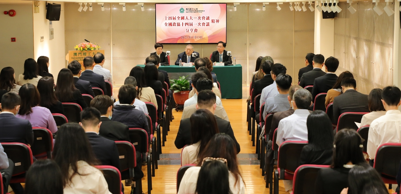 Com vista a aprofundar o conhecimento dos professores e alunos sobre os assuntos nacionais e de levar a que compreendam correctamente as principais políticas e a direcção do desenvolvimento social e económico do País e da RAEM, a Universidade Politécnica de Macau organizou, na manhã do dia 13 de Abril, uma “Sessão de Partilha do Espírito da 1.ª Sessão da 14.ª Assembleia Popular Nacional e da 1.ª Sessão do 14.º Comité Nacional da Conferência Consultiva Política do Povo Chinês”, tendo convidado o membro do Comité Permanente da Conferência Consultiva Política do Povo Chinês e Presidente do Conselho Geral, Chui Sai Cheong, o representante de Macau na Assembleia Popular Nacional e membro do Conselho Geral, Chan Hong, e o Delegado de Macau à Conferência Consultiva Política do Povo Chinês, Kou Kam Fai, para partilharem os principais conteúdos, os pontos essenciais do espírito e as suas experiências de aprendizagem das “Duas Sessões”, no sentido de promover os valores nucleares do amor à Pátria e a Macau. A sessão de partilha contou com a presença de mais de uma centena de participantes, incluindo de membros do Conselho de Administração, chefias, professores, alunos e antigos alunos da UPM.