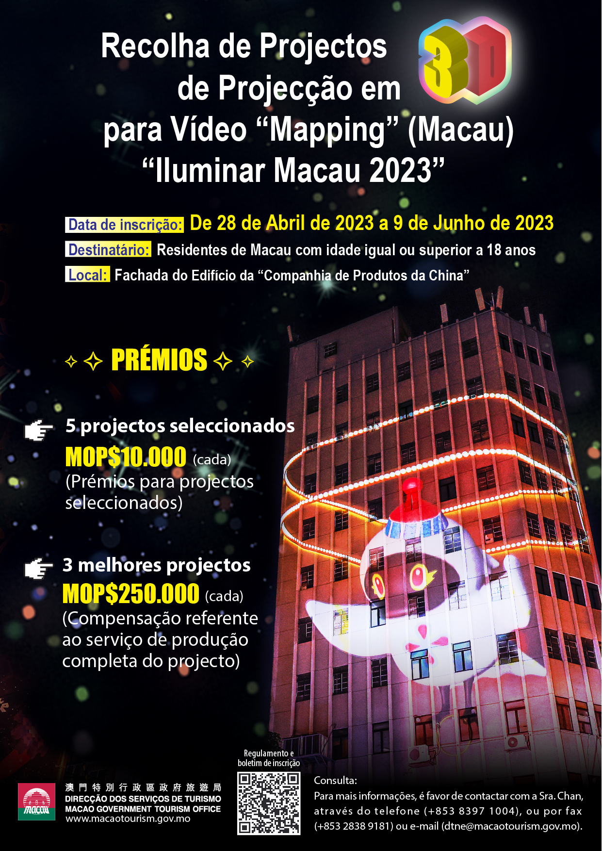 As inscrições para apresentação de projectos de Macau de vídeo mapping a 3D para o “Iluminar Macau 2023” estarão abertas a partir de hoje (dia 28) até 9 de Junho, tendo como destinatários os residentes de Macau com idade igual ou superior a 18 anos. Os interessados poderão inscrever-se e apresentar os seus trabalhos online. Os detalhes sobre o programa poderão ser consultados na Página Electrónica da Indústria Turística de Macau https://industry.macaotourism.gov.mo/pt/. Os resultados da selecção serão publicados na página electrónica da DST.