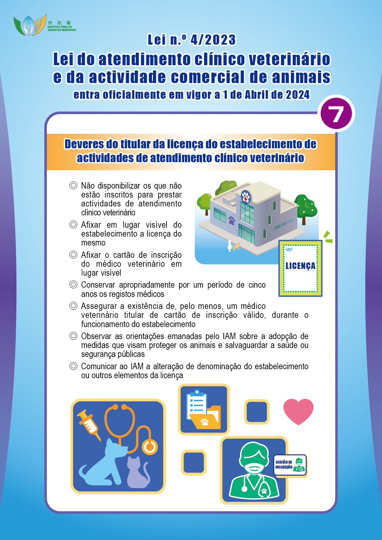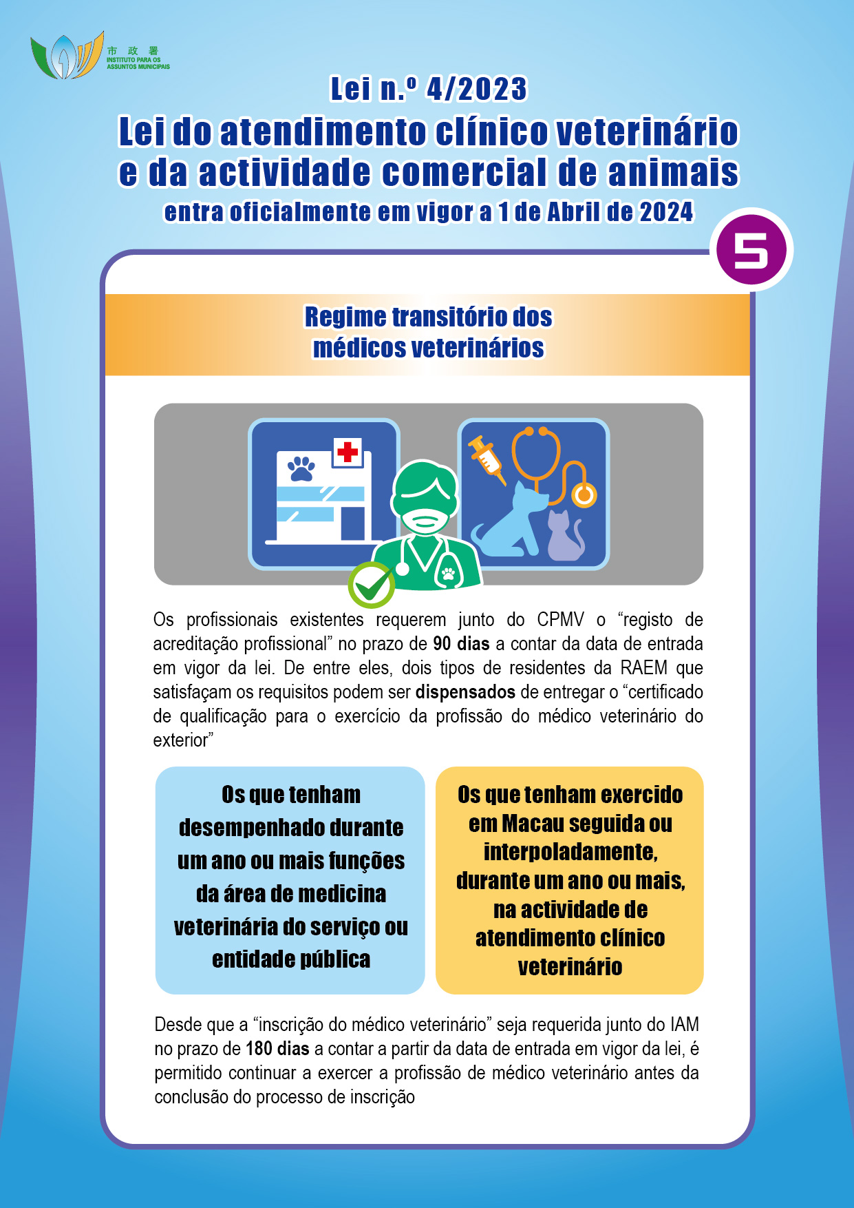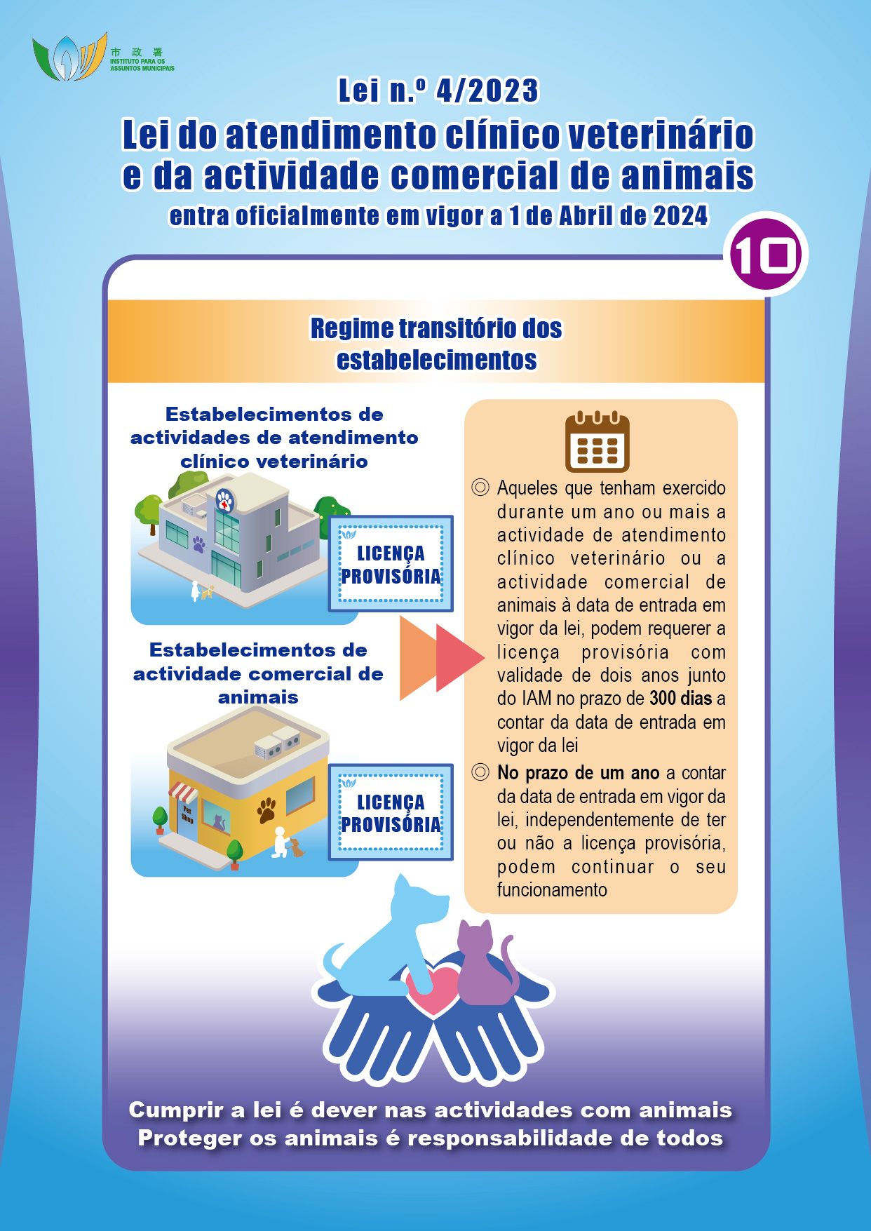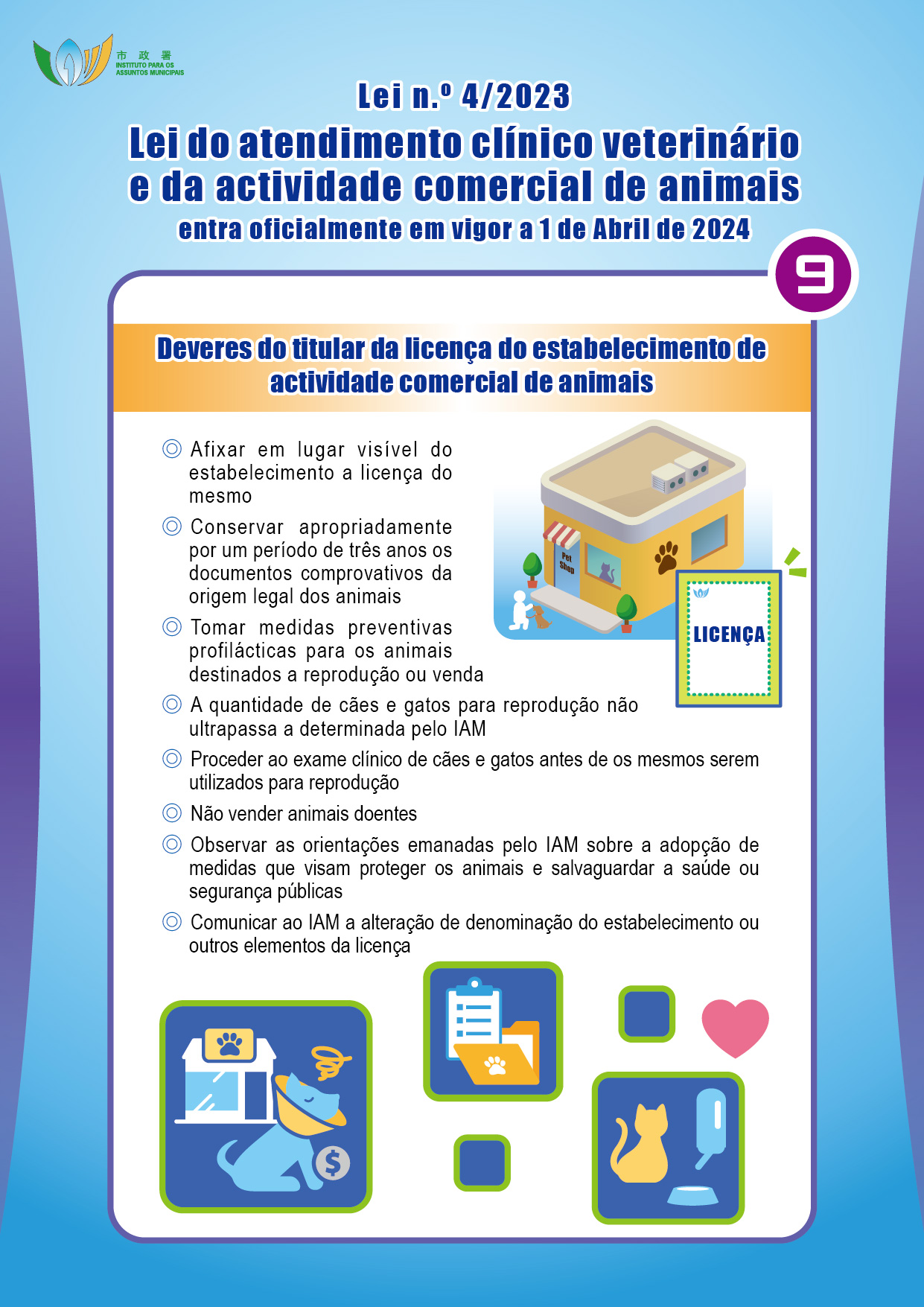Com o objectivo de promover o desenvolvimento do atendimento clínico veterinário e da actividade comercial de animais no território, reforçar a protecção dos animais e proteger a saúde pública, o Governo da RAEM elaborou a Lei n.º 4/2023 – Lei do atendimento clínico veterinário e da actividade comercial de animais, que entra em vigor no dia 1 de Abril de 2024, criando um regime de registo de acreditação profissional de médico veterinário e de fiscalização dos estabelecimentos de atendimento clínico veterinário, reprodução, venda e hospedagem de animais. O Instituto para os Assuntos Municipais (IAM) irá realizar duas sessões de esclarecimento em meados de Maio do corrente ano, destinadas ao público e aos sectores relacionados, sendo todos os interessados bem-vindos a participar.