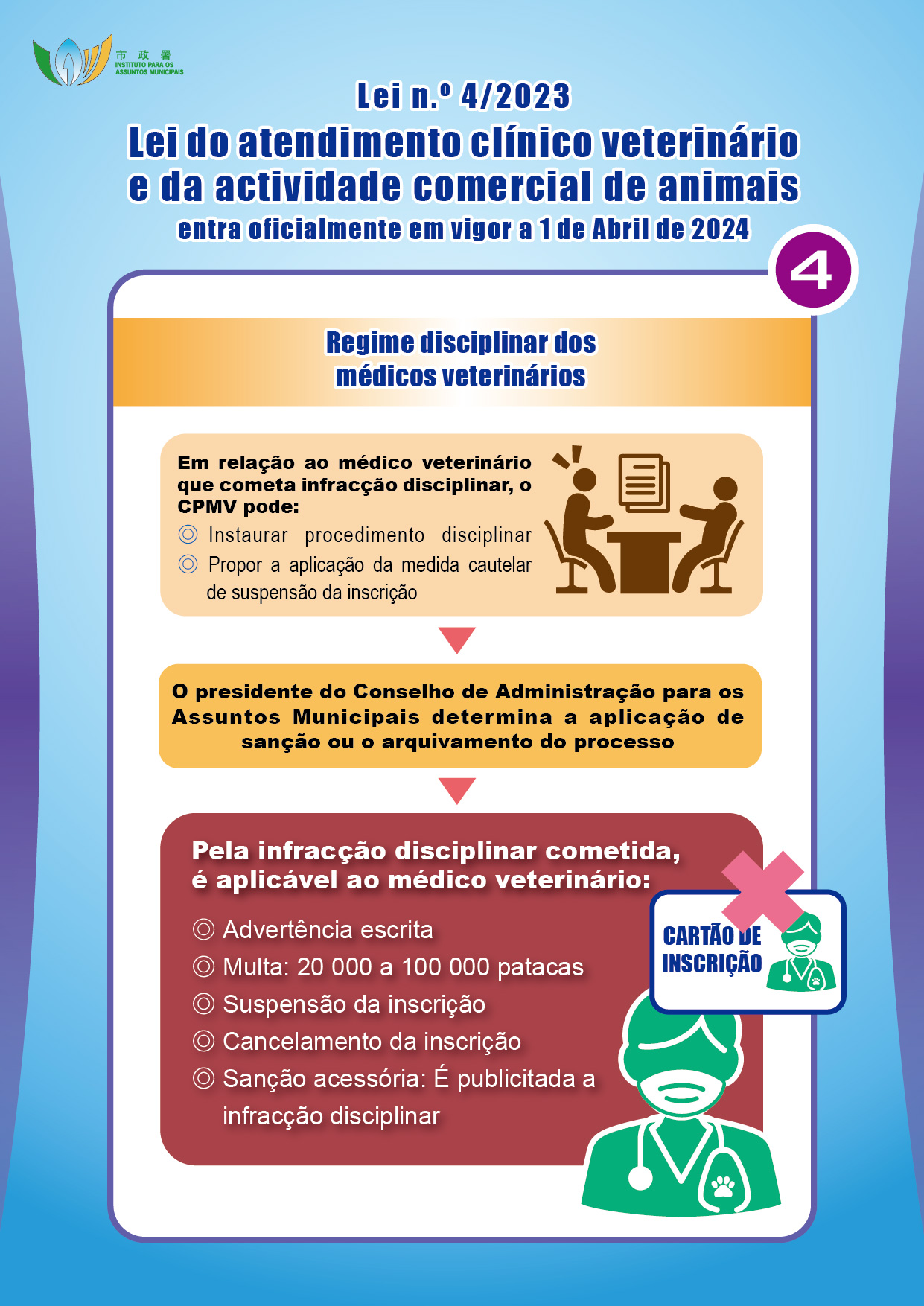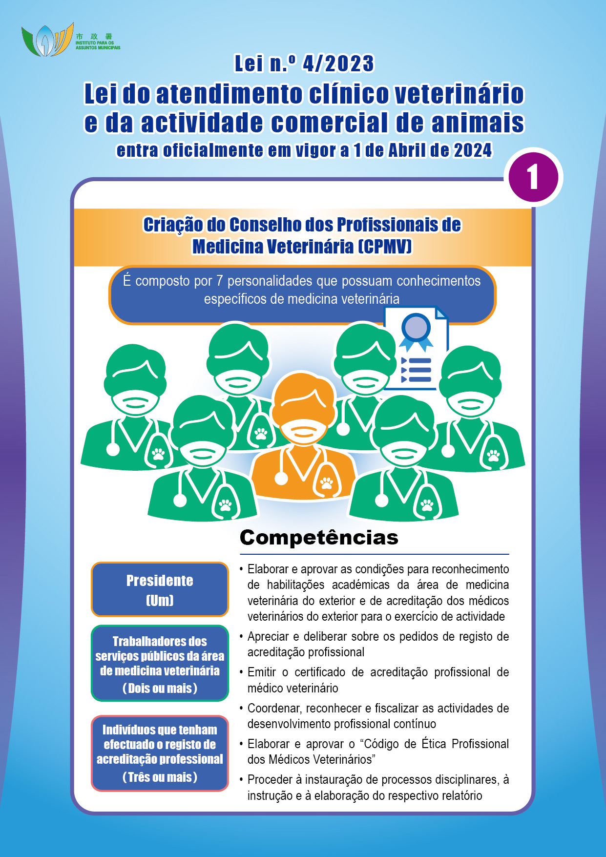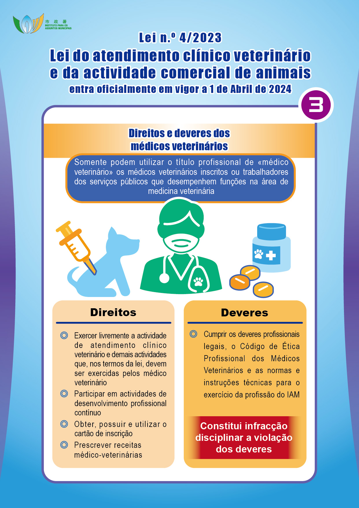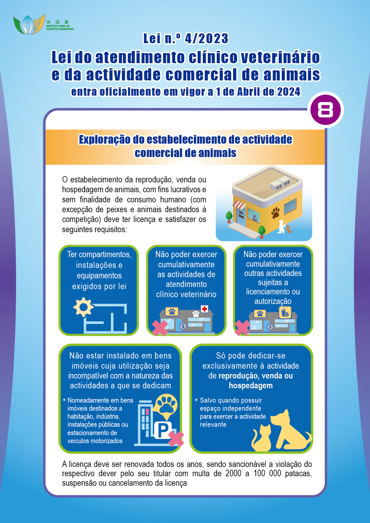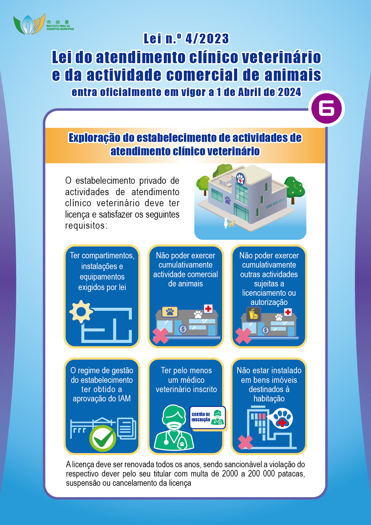 Com o objectivo de promover o desenvolvimento do atendimento clínico veterinário e da actividade comercial de animais no território, reforçar a protecção dos animais e proteger a saúde pública, o Governo da RAEM elaborou a Lei n.º 4/2023 – Lei do atendimento clínico veterinário e da actividade comercial de animais, que entra em vigor no dia 1 de Abril de 2024, criando um regime de registo de acreditação profissional de médico veterinário e de fiscalização dos estabelecimentos de atendimento clínico veterinário, reprodução, venda e hospedagem de animais. O Instituto para os Assuntos Municipais (IAM) irá realizar duas sessões de esclarecimento em meados de Maio do corrente ano, destinadas ao público e aos sectores relacionados, sendo todos os interessados bem-vindos a participar.