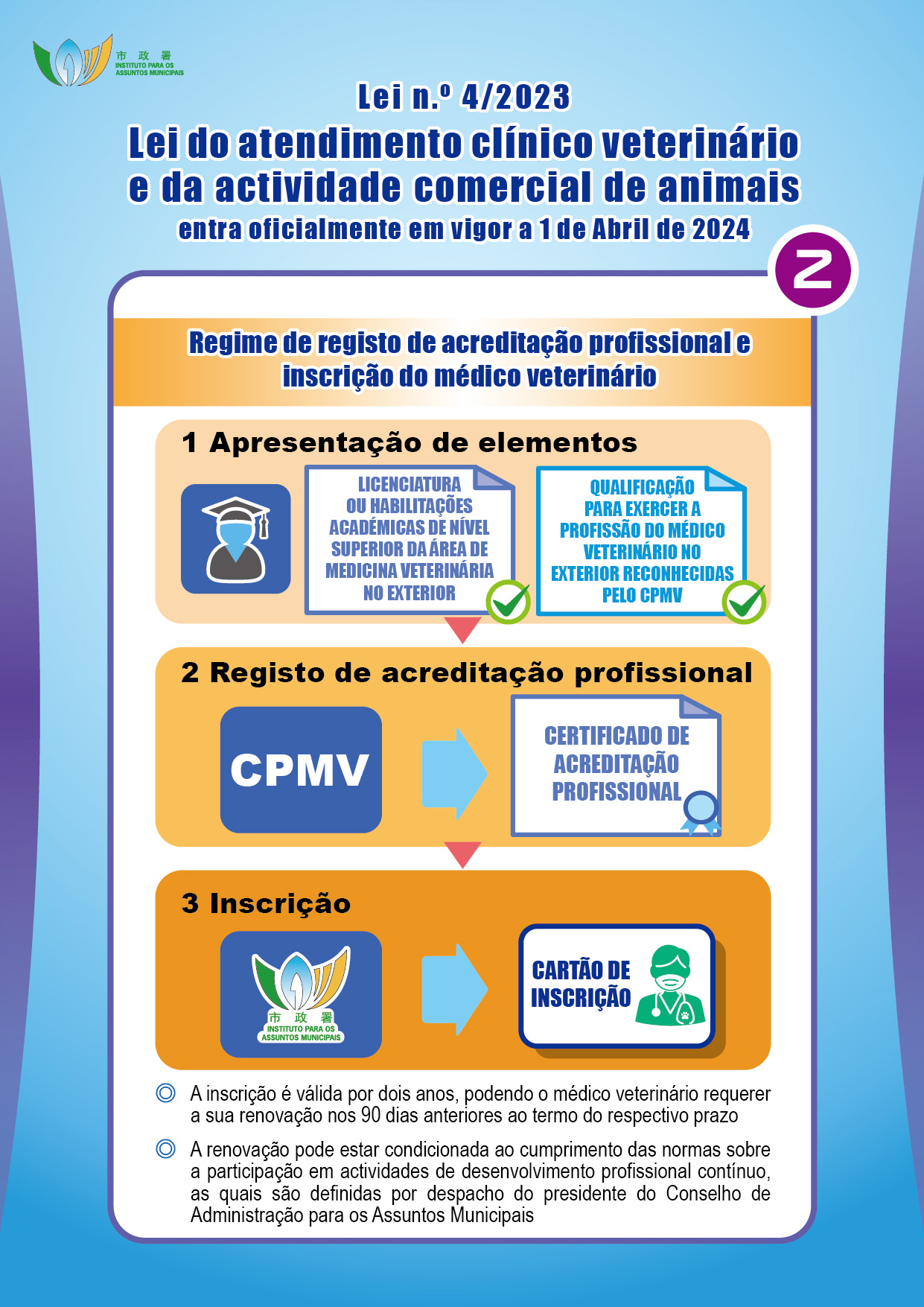 A Lei do atendimento clínico veterinário e da actividade comercial de animais estabelece o regime de registo de acreditação profissional e inscrição de médicos veterinários. A utilização do título profissional de «médico veterinário» é reservada a quem tenha obtido o “Certificado de acreditação profissional de médico veterinário”, emitido pelo Conselho dos Profissionais de Medicina Veterinária, e requeira a inscrição junto do Instituto para os Assuntos Municipais (IAM) ou a trabalhadores dos serviços públicos que desempenham funções na área de medicina veterinária. Os indivíduos que efectuarem a inscrição devem cumprir as obrigações legais, sendo o prazo de validade da inscrição de dois anos.