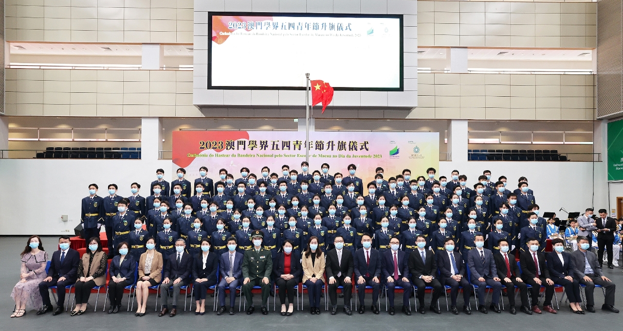 A “Cerimónia do Hastear da Bandeira Nacional pelo Sector Escolar de Macau no Dia da Juventude” realizou-se no dia 4 de Maio de 2023, pelas 08h00, no Pavilhão Polidesportivo da Universidade Politécnica de Macau. No evento, com uma actuação ao vivo da Banda da Escola Hou Kong, os membros da Equipa Escolar de Macau Responsável pelo Içar de Bandeira dirigiram-se ao local destinado ao içar da Bandeira e, solenemente, realizaram a cerimónia ao som do Hino Nacional da República Popular da China. Simultaneamente, sob a orientação dos coros de 5 escolas, Escola da Sagrada Família, Escola Primária Anexa à Escola Lou Hau, Colégio Perpétuo Socorro Chan Sui Ki, Escola Secundária Pui Ching e Escola Luso-Chinesa Técnico-Profissional, todos os presentes cantaram, em voz alta, o hino nacional, ficando o pavilhão repleto de vozes fortes e harmoniosas, em demonstração de um entusiasmante sentimento patriótico. De seguida, os mestres-de-cerimónias apresentaram, no palco, a origem do Movimento de 4 de Maio e a aluna da Escola de Aplicação Anexa à Universidade de Macau, Chen On Chi, transmitiu o espírito do Movimento de 4 de Maio através do seu discurso.