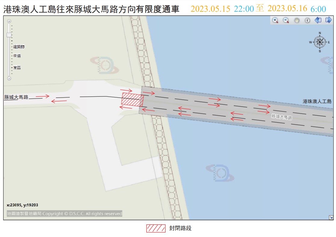 Com vista a melhorar o problema de envelhecimento das juntas de dilatação na junção entre a Avenida de Tun Seng da Zona A dos Novos Aterros Urbanos e a ponte de ligação da Ilha Artificial de Hong Kong-Zhuhai-Macau, terá início a obra de reparação das juntas de dilatação, das 22:00 horas às 6:00 horas do dia seguinte nos dias 15 e 16 do corrente mês, sendo condicionada a circulação dos veículos num troço da Avenida de Tun Seng perto da Estrada Circular Fronteiriça de Hong Kong-Zhuhai-Macau (vide desenho).