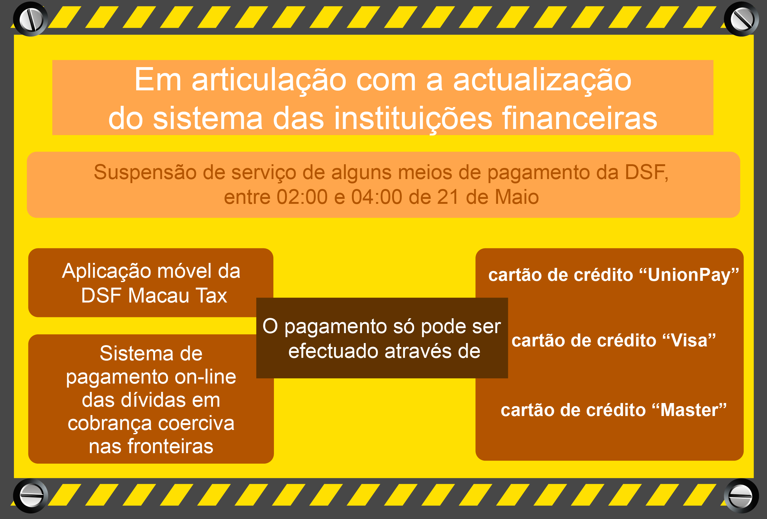 Em articulação com a actualização do sistema por parte das instituições financeiras, no dia 21 de Maio, entre as 02:00 e as 04:00 da madrugada, quando efectuarem o pagamento, mediante o recurso à aplicação móvel “MacauTax” da Direcção dos Serviços de Finanças ou ao “Sistema de pagamento on-line das dívidas em cobrança coerciva nas fronteiras”, só podem utilizar os cartões de crédito da “UnionPay”, “Visa” e “Master” para os devidos efeitos. O serviço de pagamento vai ser retomado após a actualização do sistema, pelo que apresentamos as nossas sinceras desculpas pelos inconvenientes causados.
