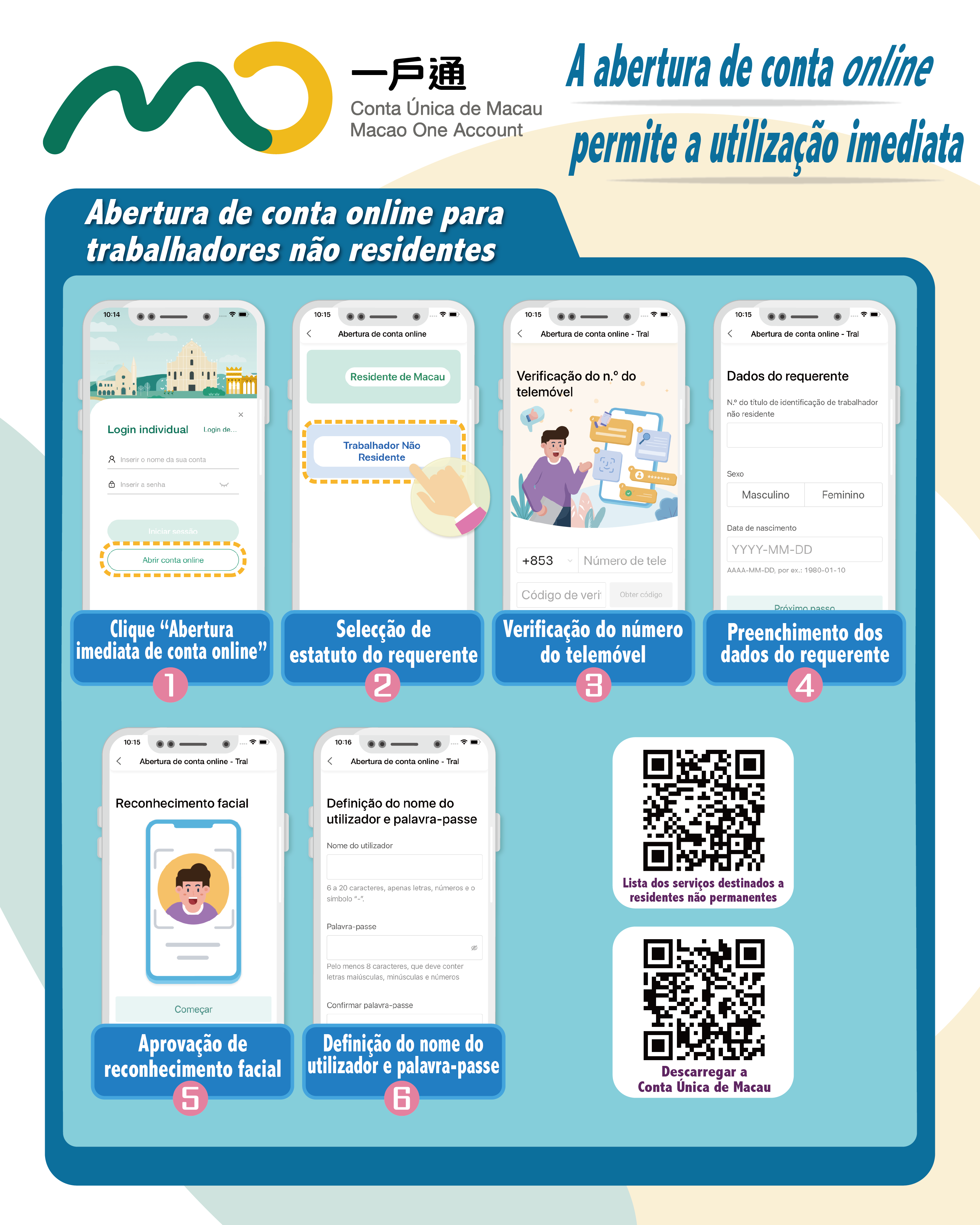 Para abrir a conta online, os trabalhadores não residentes bastam descarregar a aplicação da Conta Única de Macau para telemóvel, inserir o seu número de telemóvel para obter o código de verificação, preencher os seus dados pessoais, efectuar o reconhecimento facial seguindo as indicações e criar o nome da conta e senha, deste modo está criada a conta na Conta Única de Macau.