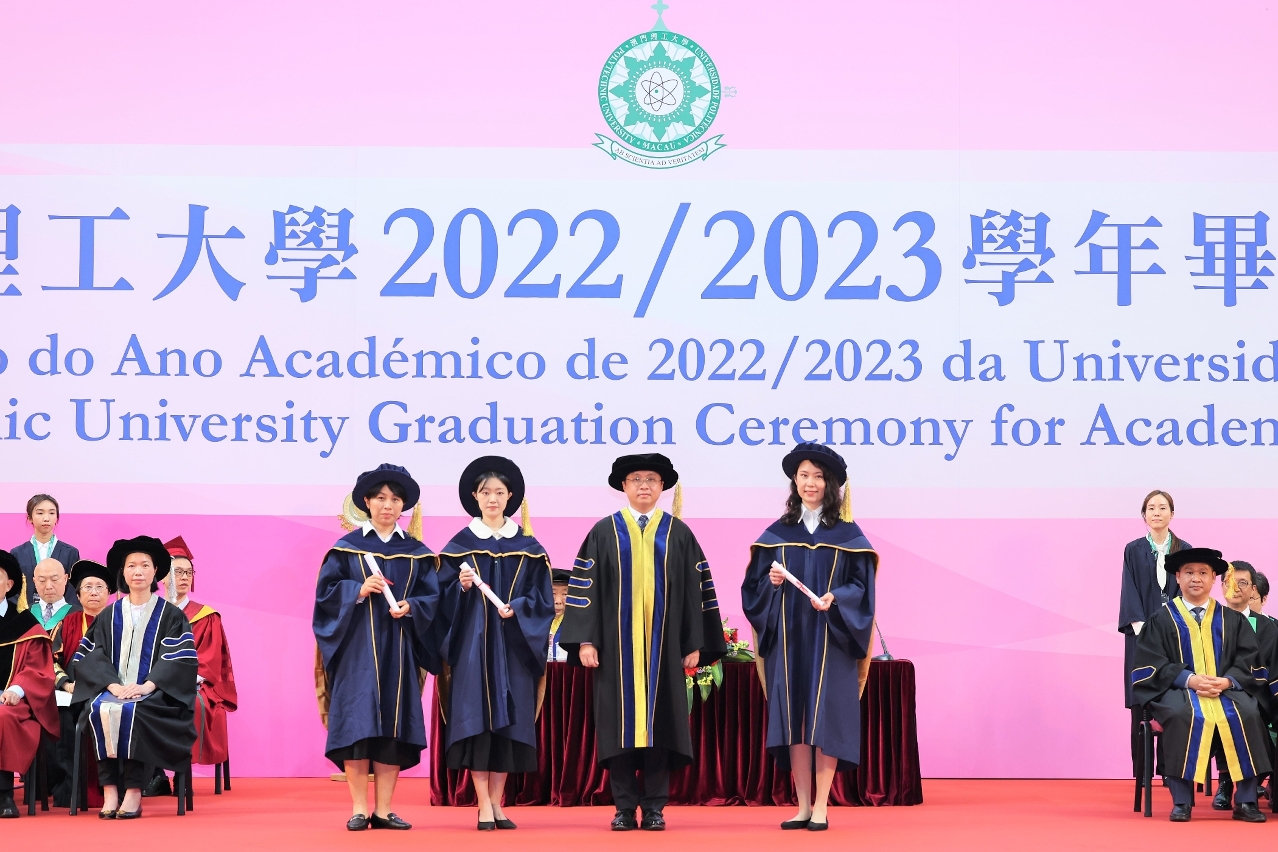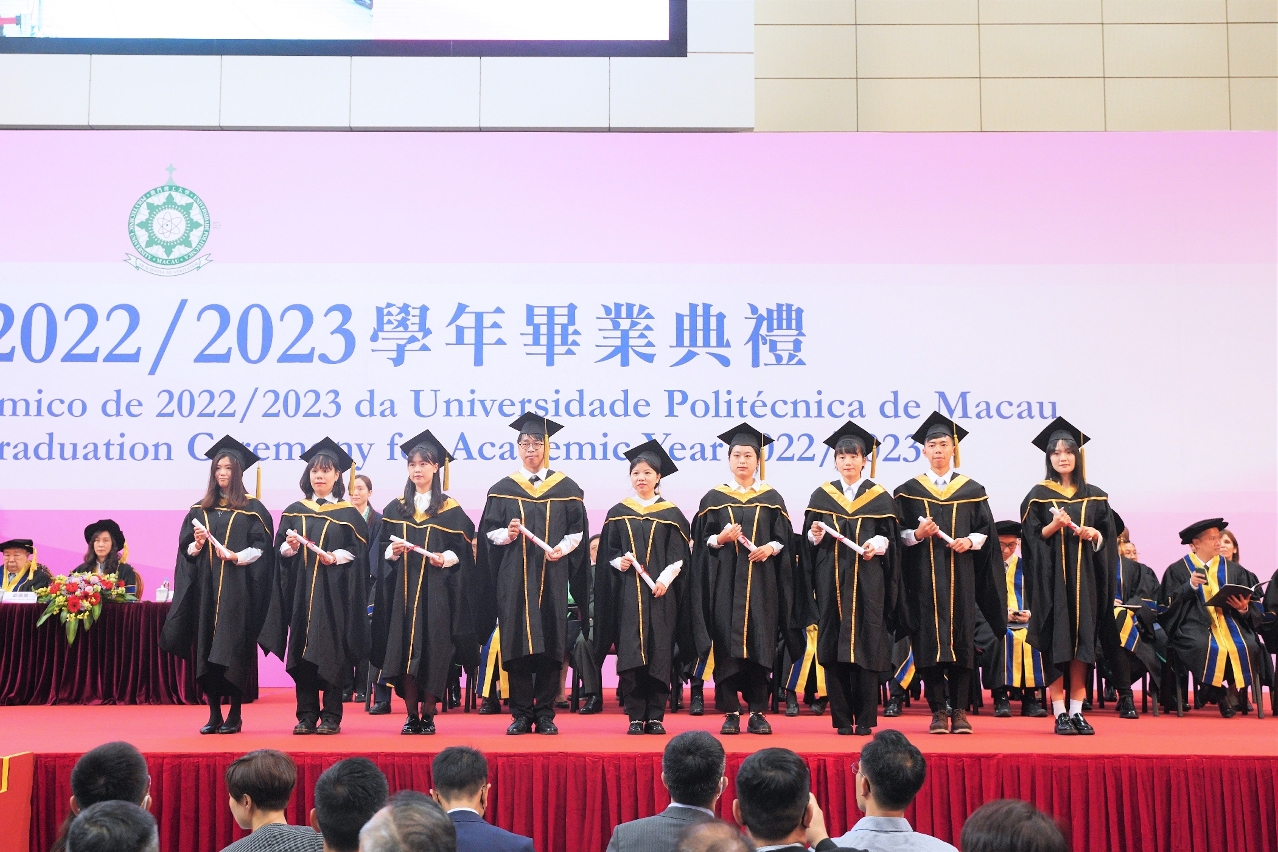 A Cerimónia de Graduação do Ano Académico 2022/2023 da Universidade Politécnica de Macau (UPM) teve lugar no dia 31 de Maio, pelas 16:00 horas, no Pavilhão Polidesportivo da UPM. A Cerimónia foi iniciada com o hastear da Bandeira Nacional e com a execução instrumental e vocal do Hino Nacional da República Popular da China (RPC). Mais de 800 estudantes dos cursos de doutoramento, mestrado e licenciatura graduaram-se. Na mesma ocasião foram entregues os graus de doutor honoris causa a personalidades com grandes êxitos académicos ou com destacadas contribuições para o desenvolvimento social e educativo. A Secretária para os Assuntos Sociais e Cultura, Ao Ieong U, em representação do Chefe do Executivo da Região Administrativa Especial de Macau (RAEM) e Chanceler da Universidade Politécnica de Macau, afirmou que o Governo da RAEM continuará a apoiar a UPM na implementação do seu princípio educativo de “dar igual importância ao ensino e à investigação científica”, no intuito de formar mais quadros de excelência para Macau e para o País e para potenciar a obtenção de melhores resultados de investigação científica e tecnológica.