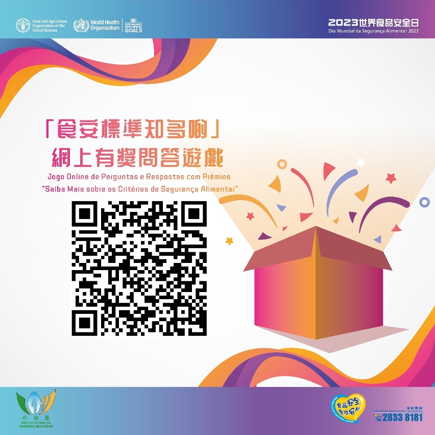 Para responder ao tema “Normas Alimentares Salvam Vidas”, do Dia Mundial de Segurança Alimentar, o IAM realiza, entre 7 e 21 de Junho, o Jogo Online de Perguntas e Respostas com Prémios “Saiba Mais sobre os Critérios de Segurança Alimentar”, que inclui informações sobre segurança alimentar práticas e frequentes na vida quotidiana, a fim de levar os participantes a conhecer os critérios de segurança alimentar de Macau durante o jogo. Os cidadãos são bem-vindos a participar.
