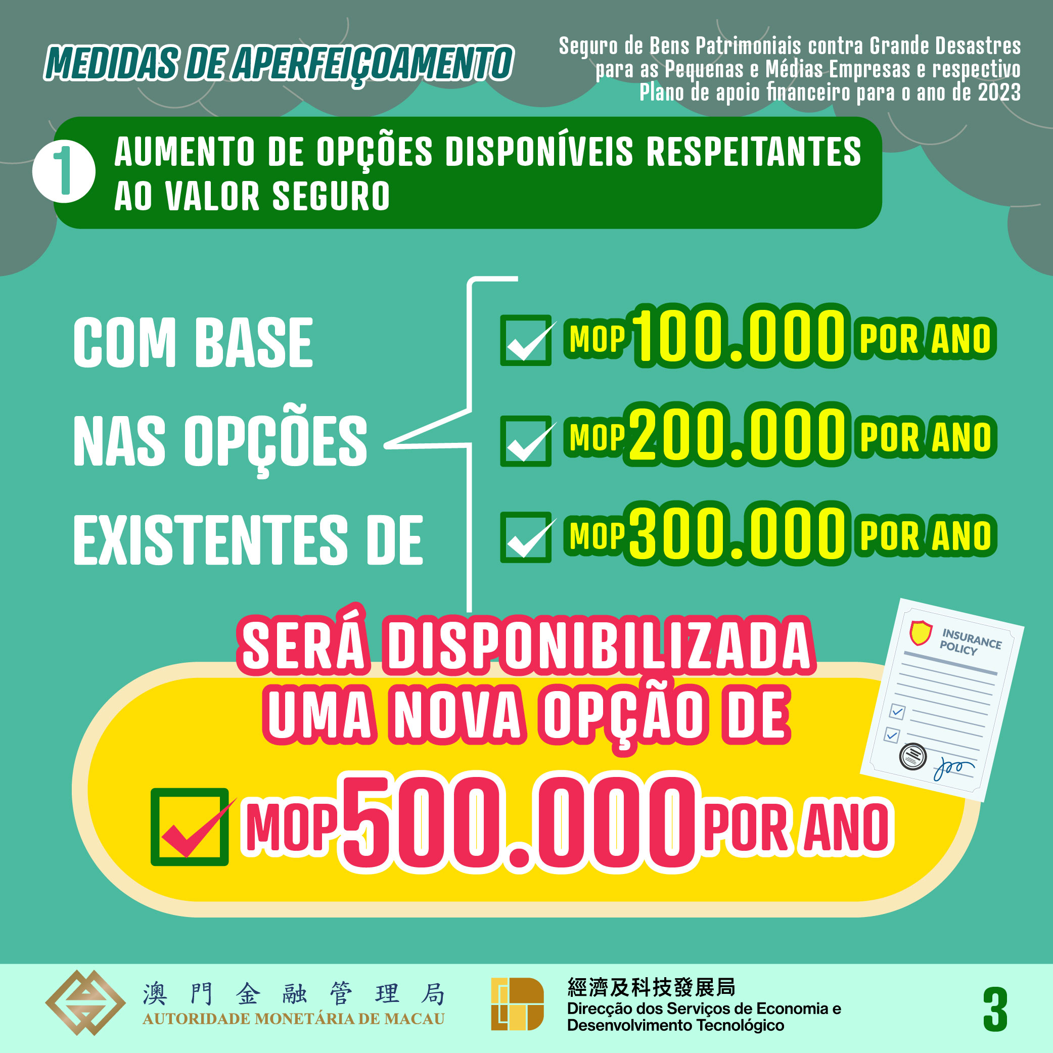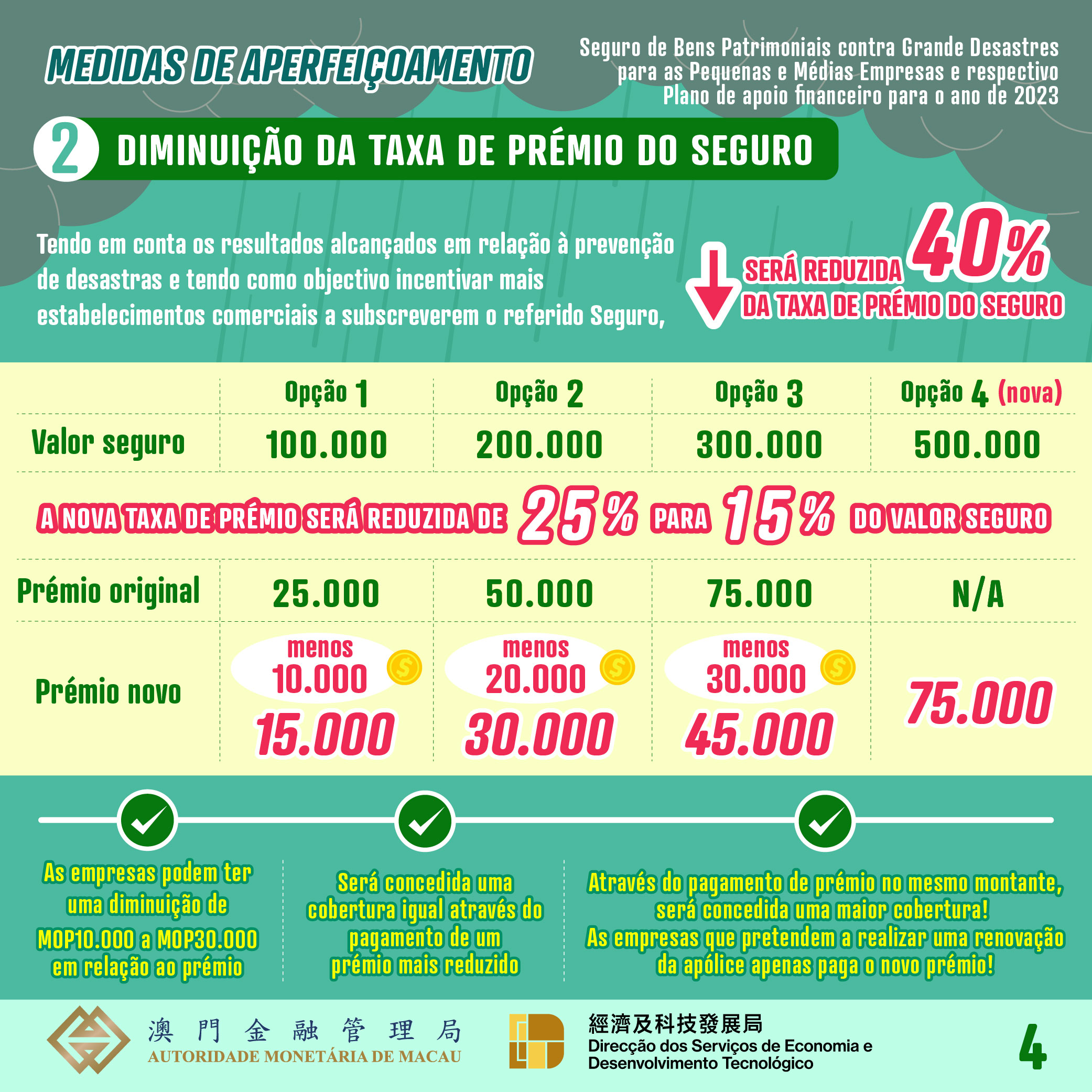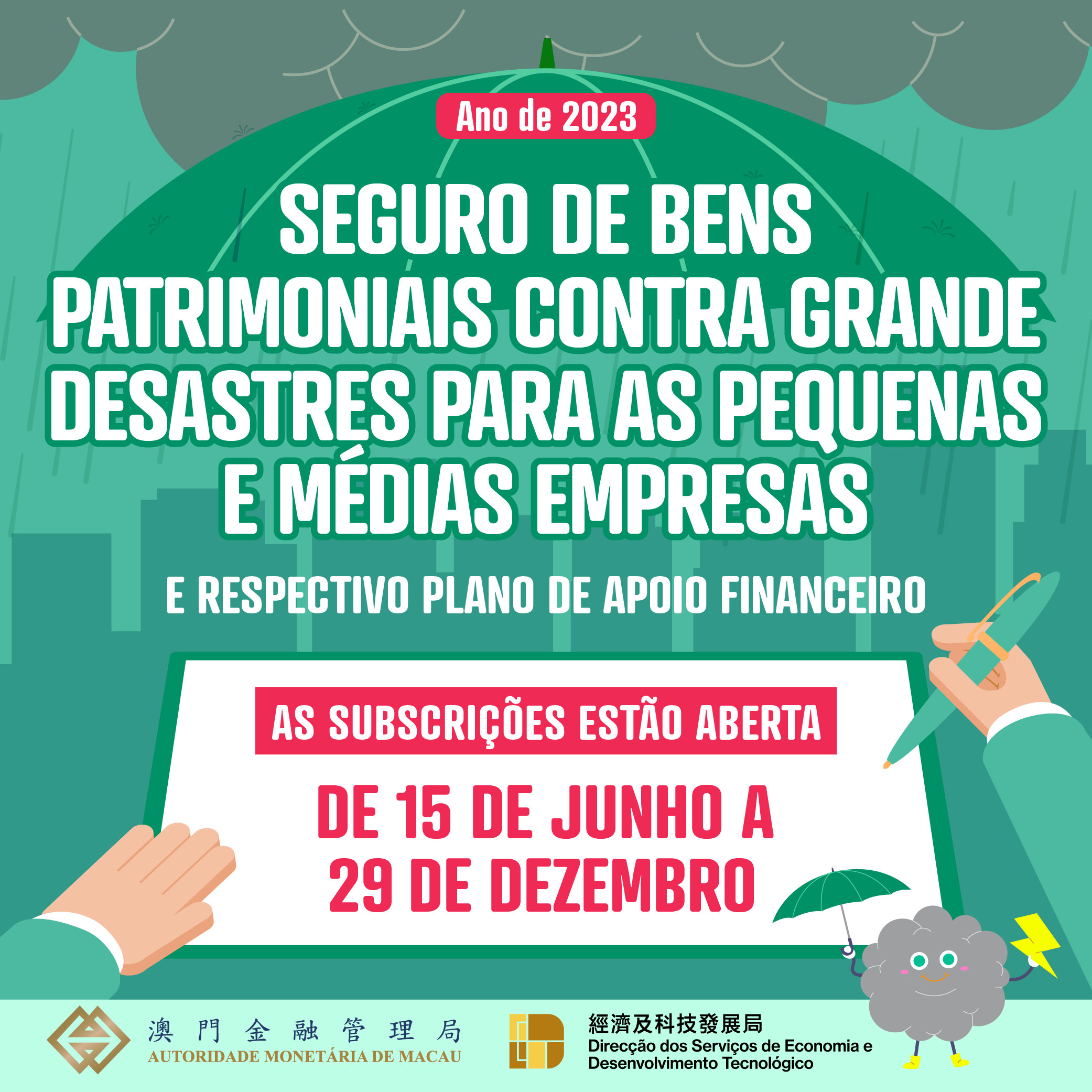 No período compreendido entre a data de hoje e até a 29 de Dezembro de 2023, as PMEs podem subscrever um “Seguro contra grandes desastres” para cada estabelecimento comercial, através das cinco seguradoras de Macau, participantes no plano supramencionado para o ano de 2023. Para além dos valores seguros estabelecidos nos anos anteriores, de MOP100.000, MOP200.000 e MOP300.000, será adicionada uma nova opção de cobertura de MOP500.000 para este ano, permitindo aos comerciantes optarem por adquirir uma cobertura maior. A taxa de prémio foi reduzida, de forma cabal, de 40% para 15% em todos os casos, sendo os prémios correspondentes aos montantes de cobertura acima referidos de MOP15.000, MOP30.000, MOP45.000 e MOP75.000.