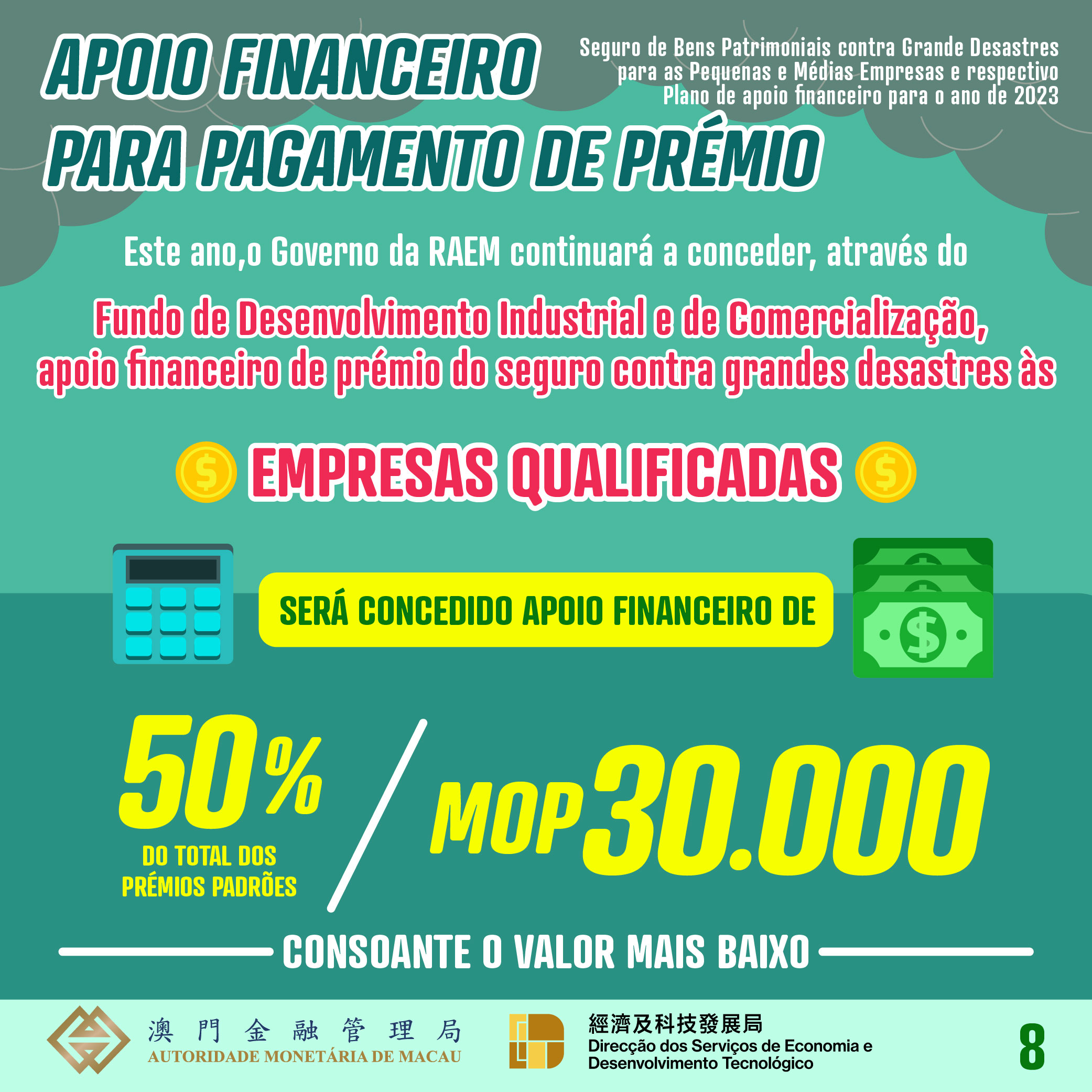 Entretanto, o Governo da RAEM continuará a conceder, através do Fundo de Desenvolvimento Industrial e de Comercialização, o apoio financeiro de prémio do seguro contra grandes desastres às PMEs qualificadas que preencham os requisitos estabelecidos, sendo que o valor do apoio financeiro equivale a 50% ou a MOP30.000 do total anual do prémio padrão (consoante o valor mais baixo), com o intuito de reduzir os encargos financeiros das mesmas. Aliás, com os benefícios decorrentes do Plano de apoio financeiro, os comerciantes podem poupar mais de 50% dos prémios.