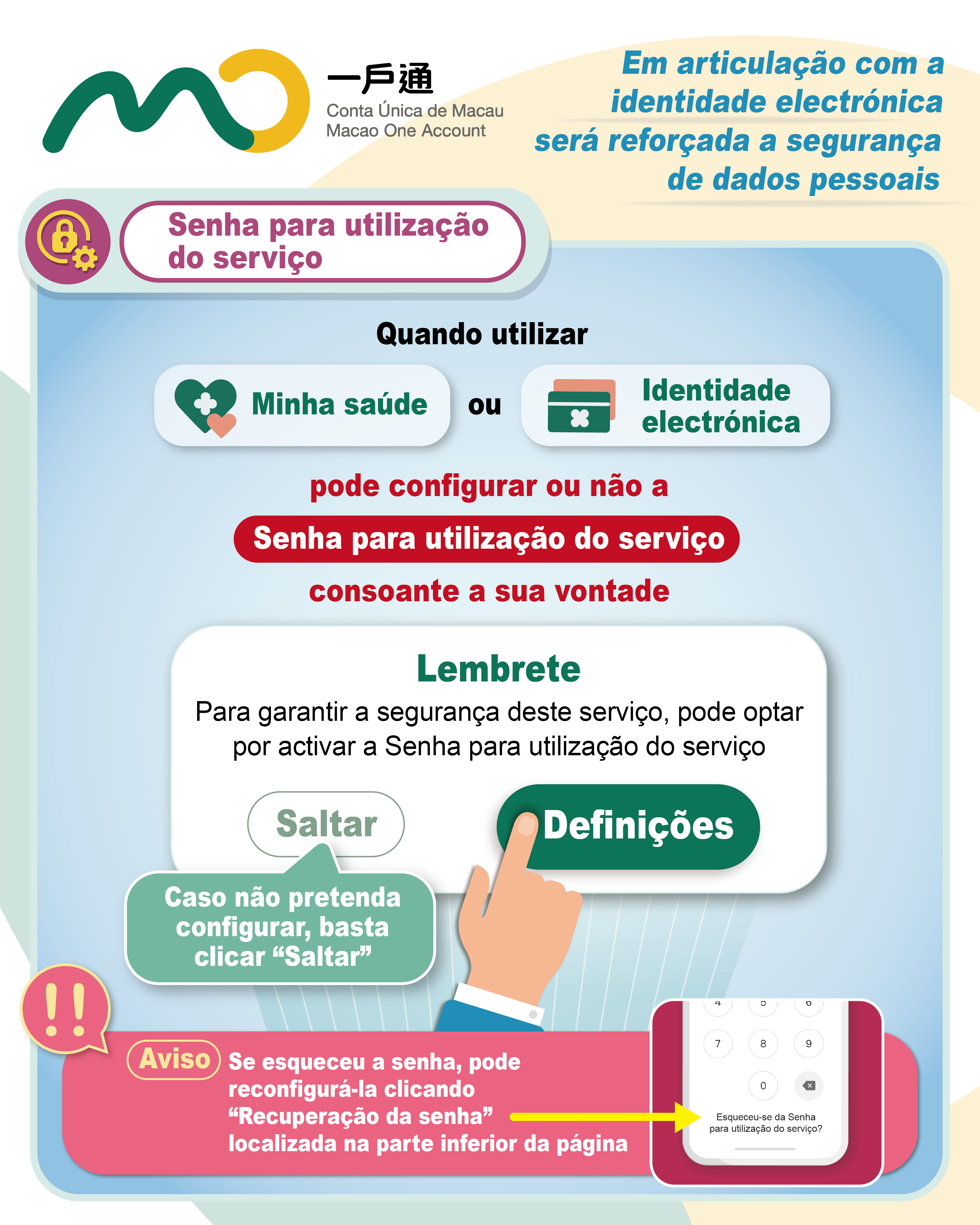 Os residentes, após actualizarem a versão mais recente da Conta Única de Macau, ao utilizarem o serviço “Identidade electrónica” ou “Minha saúde”, serão avisados dessa função por uma janela pop-up. Os residentes podem, consoante a sua própria vontade, configurar, ou não, uma senha destinada à utilização dos dois serviços acima referidos. Os utilizadores que pretendem configurar a senha podem fazê-lo conforme as instruções e, caso contrário, podem clicar directamente “Saltar”. Se esqueceu a senha, basta reconfigurá-la clicando “Recuperação da senha” localizada na parte inferior da página.