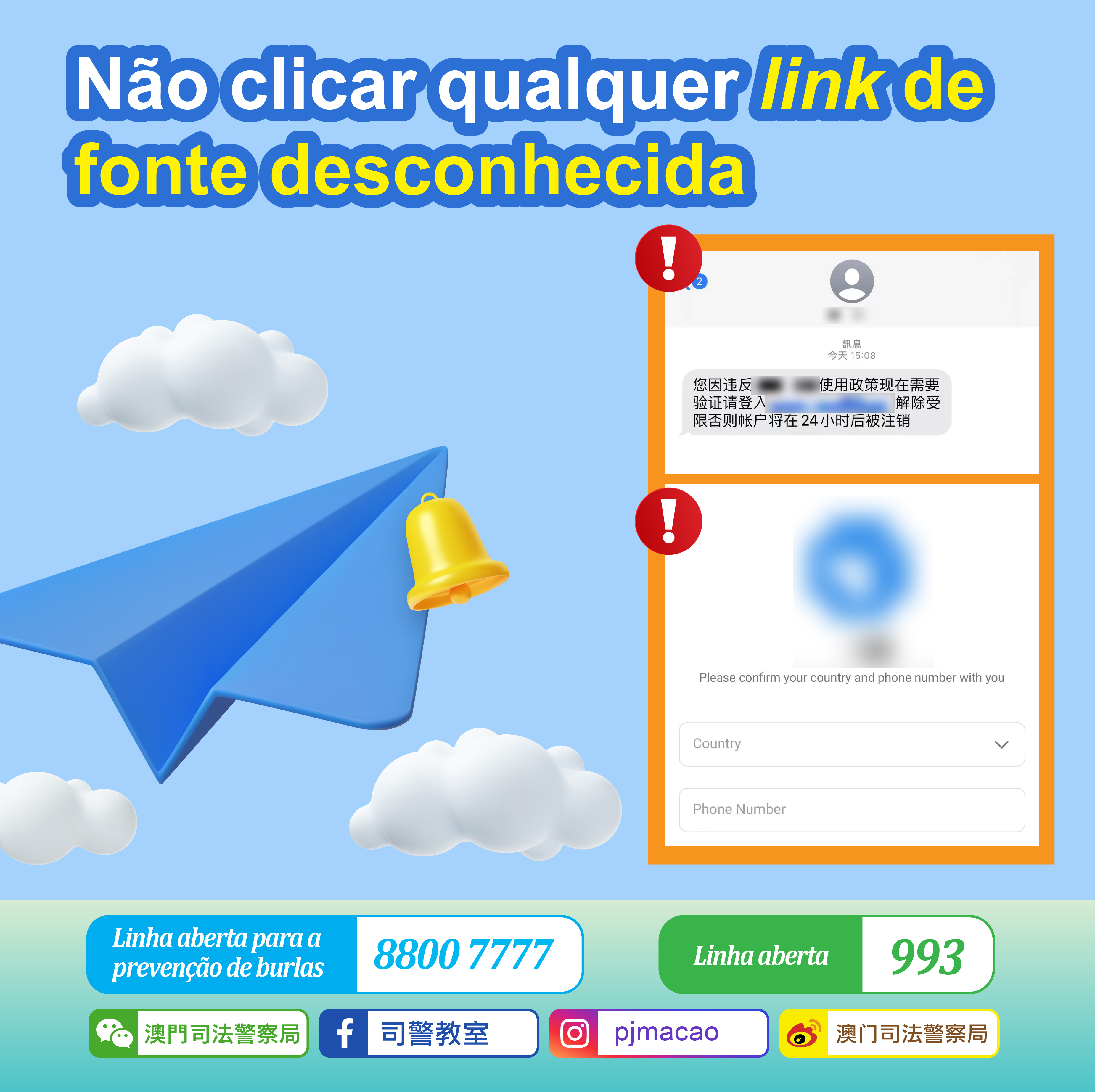 Nos últimos anos, os criminosos usaram o referido modus operandi para roubar contas de mensagens instantâneas e, em seguida, tentaram burlar “os amigos” constantes nas listas de contactos, causando alguns casos com prejuízo. Assim, a PJ apela à população para se manter atenta e a não clicar em links suspeitos nas mensagens SMS. Devem sempre confirmar as mesmas mensagens através de meio oficial, verificar se o URL do site é exactamente igual ao do site oficial e não fornecerem os dados da suas contas ou código de verificação. Apela ainda a quem estiver perante uma situação de burla ou perante qualquer tipo de crime, para fazer a denúncia à PJ através da linha aberta para a prevenção de burlas, nº 8800 7777 ou da linha aberta 993.