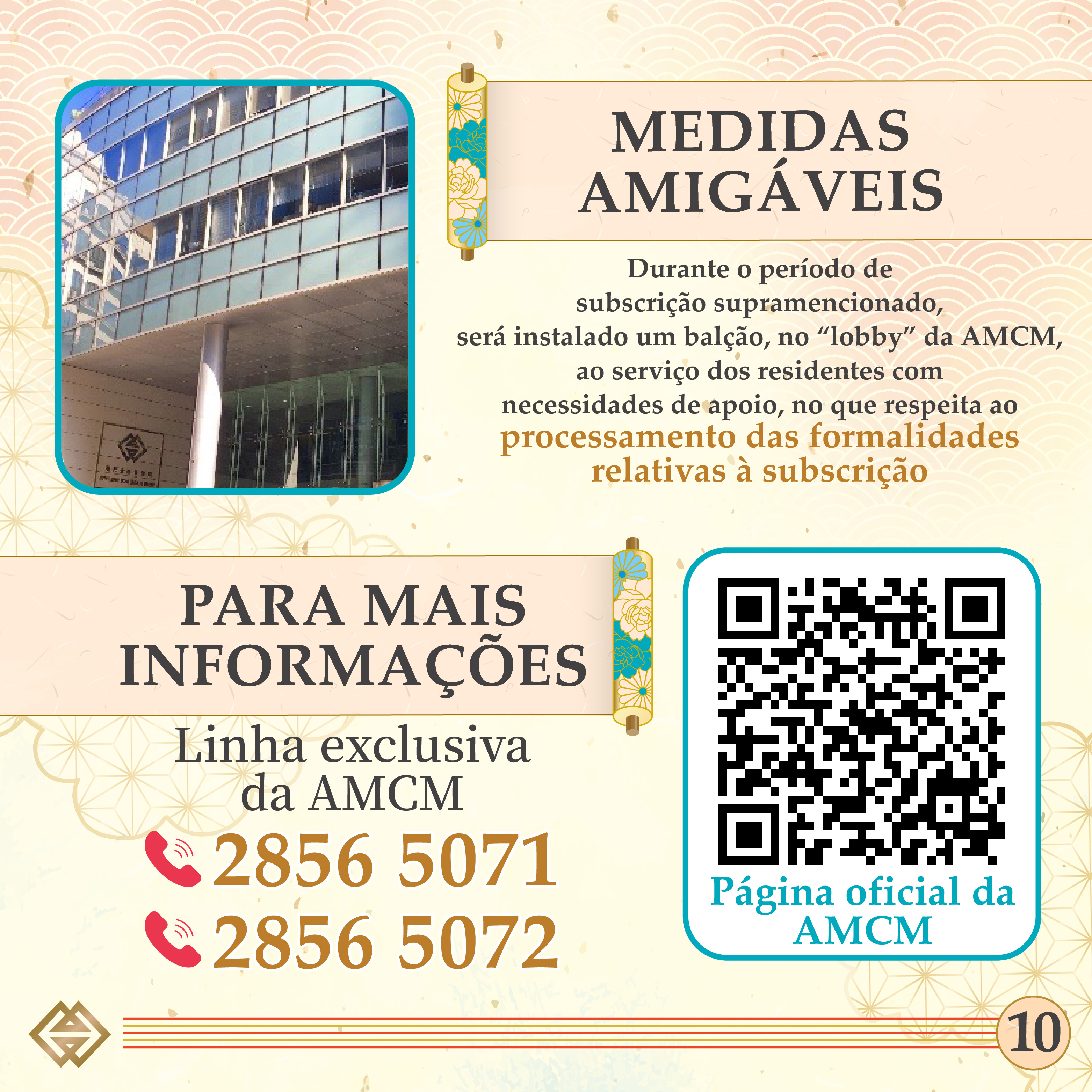Os titulares de Bilhete de Identidade de Residente válido, com idade mínima de 18 anos, podem subscrever as referidas moedas comemorativas, das 9:00 horas do dia 10 de Julho de 2023 às 18:00 horas do dia 28 de Julho de 2023, através do “website” da AMCM (https://registration.amcm.gov.mo/COCSCollection/terms_pt.html). Durante o período de subscrição supramencionado, será instalado um balcão, no “átrio” da AMCM, ao serviço dos cidadãos que necessitem de assistência.