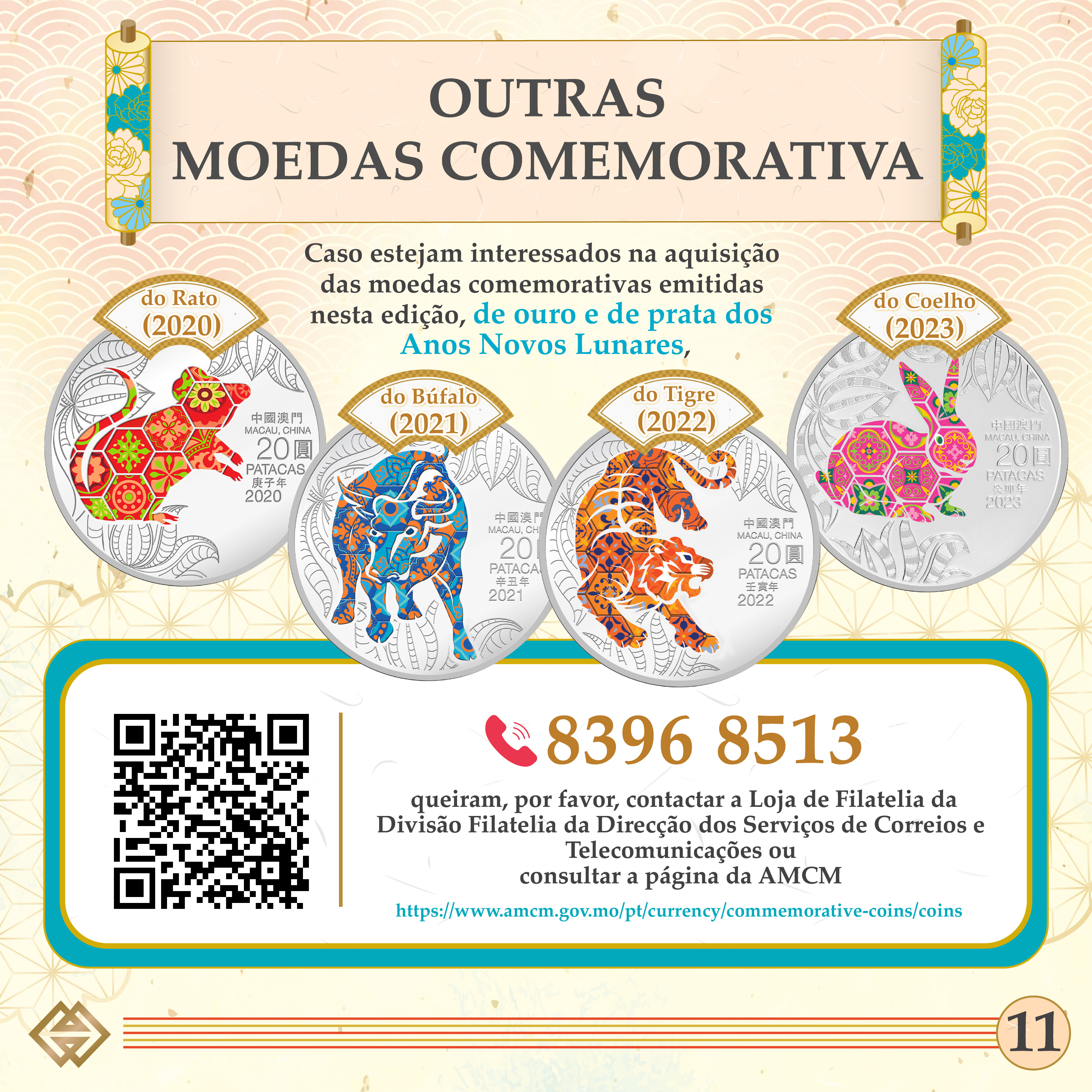 Caso estejam interessados na aquisição das moedas comemorativas emitidas nesta edição, de ouro e de prata dos Anos Novos Lunares, queiram, por favor, contactar a Loja de Filatelia da Divisão Filatelia da Direcção dos Serviços de Correios e Telecomunicações (Tel: 8396 8513), ou consultar a página da AMCM (https://www.amcm.gov.mo/pt/currency/commemorative-coins/coins).