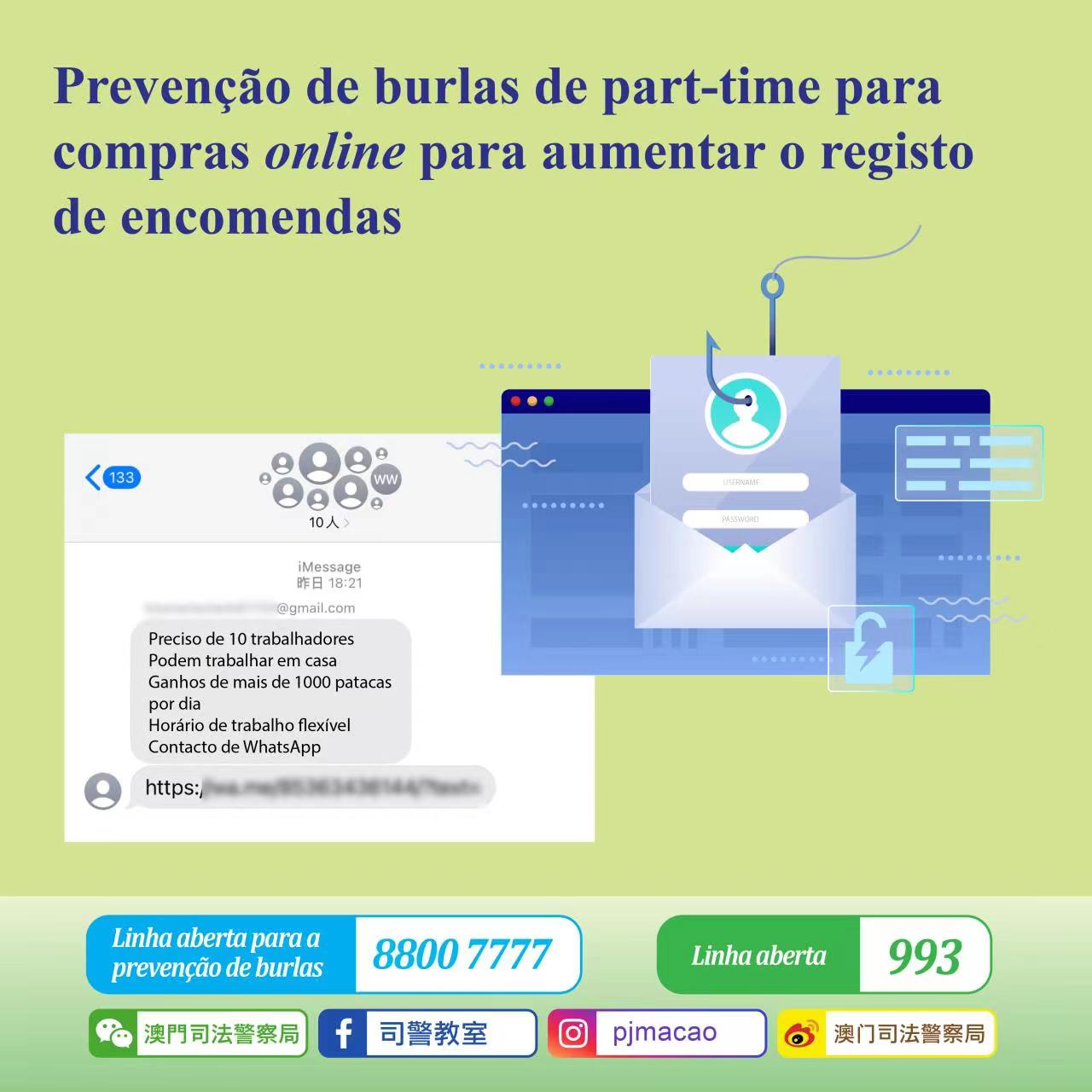 A PJ recebeu denúncias, nos últimos dias, referentes a mensagens que os burlões enviaram através da rede do smartphone onde faziam anúncio de recrutamento para trabalho em part-time para fazer aumentar o registo de encomendas através de compras online. Segundo o anúncio, o trabalhador poderá trabalhar em casa e ganhar mais de mil patacas por dia. O conteúdo de trabalho é ajudar “lojista na rede” fazendo aumentar a quantidade de gosto. Para isso, pedia-se às vítimas foram que fizessem compras na plataforma indicada, devendo fazer primeiro o pagamento com o seu próprio dinheiro até se atingir um valor especificado. Entretanto, ao atingir-se o valor exigido, ser-lhes-ia devolvido o dinheiro juntamente com a comissão. Somente quando a vítima aumentou o valor de compras e não conseguiu receber o dinheiro é que reconheceu ter caído numa armadilha lançada por burlões.
