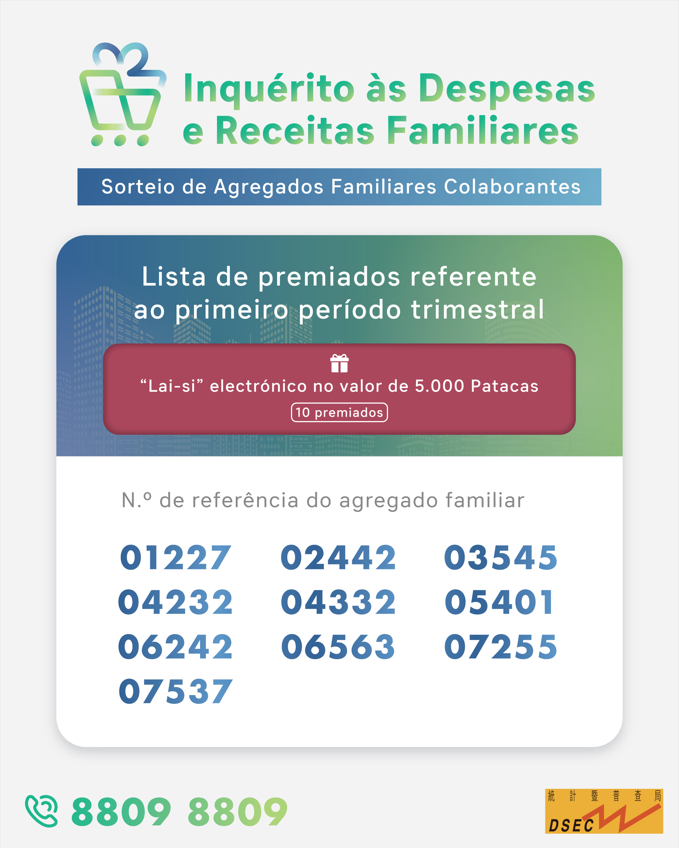 No dia 18 de Julho de 2023 realizou-se a cerimónia do “Sorteio de Agregados Familiares Colaborantes” referente ao primeiro período trimestral, tendo sido sorteados 10 agregados familiares, cujos números de referência são os seguintes: 01227; 02442; 03545; 04232; 04332; 05401; 06242; 06563; 07255 e 07537. Os agregados familiares premiados serão notificados por carta da DSEC.