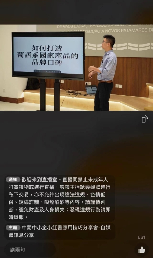 A primeira “Sessão de Partilha sobre as Técnicas de Utilização de Xiaohongshu para as Pequenas e Médias Empresas da China e dos Países de Língua Portuguesa”, organizada pelo Instituto de Promoção do Comércio e do Investimento de Macau (IPIM), foi realizada dia 20 no Complexo da Plataforma de Serviços para a Cooperação Comercial entre a China e os Países de Língua Portuguesa, em formato online e offline, atraindo um total mais de 1.000 representantes de empresas, que se reuniram para discutir sobre a expansão no Interior da China através das compras online e nas redes sociais.