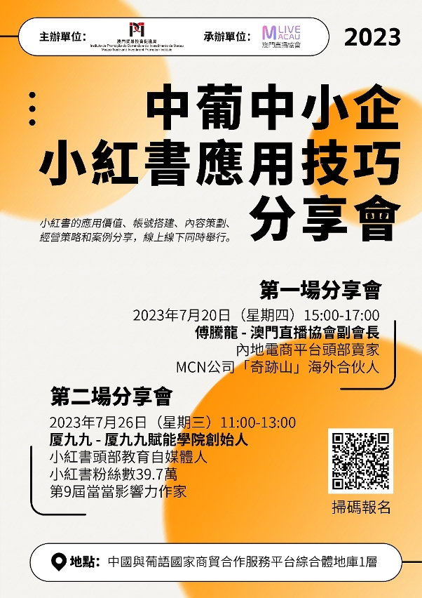 A segunda “Sessão de Partilha sobre as Técnicas de Utilização de Xiaohongshu para as Pequenas e Médias Empresas da China e dos Países de Língua Portuguesa” será também realizada em formato offline (no Complexo da Plataforma de Serviços para a Cooperação Comercial entre a China e os Países de Língua Portuguesa) e online (transmissão ao vivo), no dia 26, das 11h00 às 13h00. Para a inscrição no evento ou mais informações, visite a página electrónica (https://www.platformchinaplp.mo/) ou consulte através do número de telefone 8798 9768 / 8798 9757.