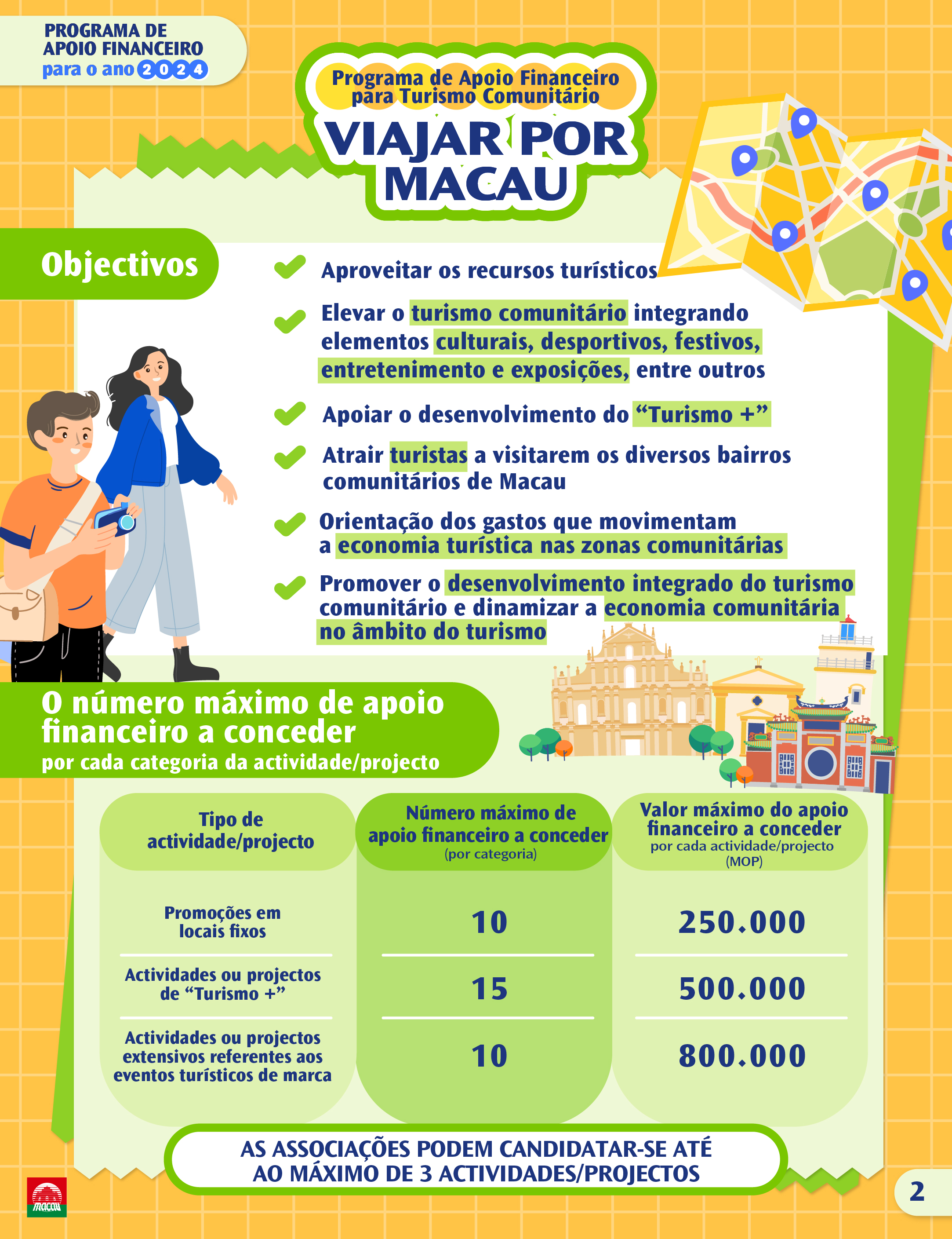 Programa de Apoio Financeiro para o Turismo Comunitário “Viajar por Macau”: Aproveitar os diferentes recursos turísticos, elevar o turismo comunitário, integrando elementos culturais, desportivos, festivos, de entretenimento e exposições, entre outros, bem como, através da participação activa das micro, pequenas e médias empresas, revitalizar o ambiente de negócios, e atrair os visitantes internacionais a visitarem os bairros comunitários.