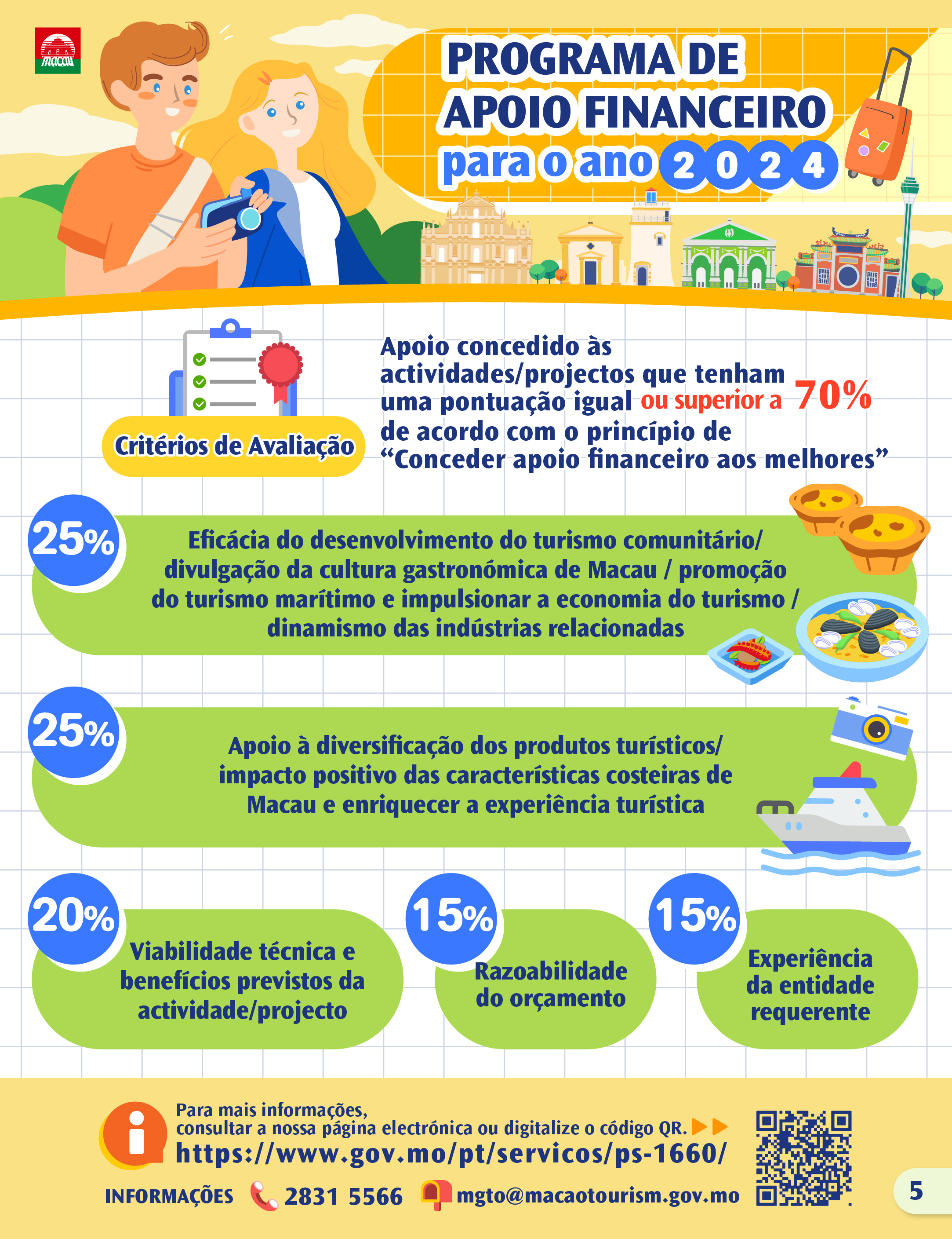 O Fundo de Turismo estabeleceu critérios de avaliação específicos para cada plano de apoio financeiro, irá avaliar e analisar cuidadosamente todos os pedidos e concedendo apoio financeiro com base nos princípios de seleccionar aqueles “merecedores de subsídio” e “financiar de forma adequada”. Para mais informações sobre a candidatura aos três programas de apoio financeiro para o ano de 2024, visitar https://www.gov.mo/pt/servicos/ps-1660/.