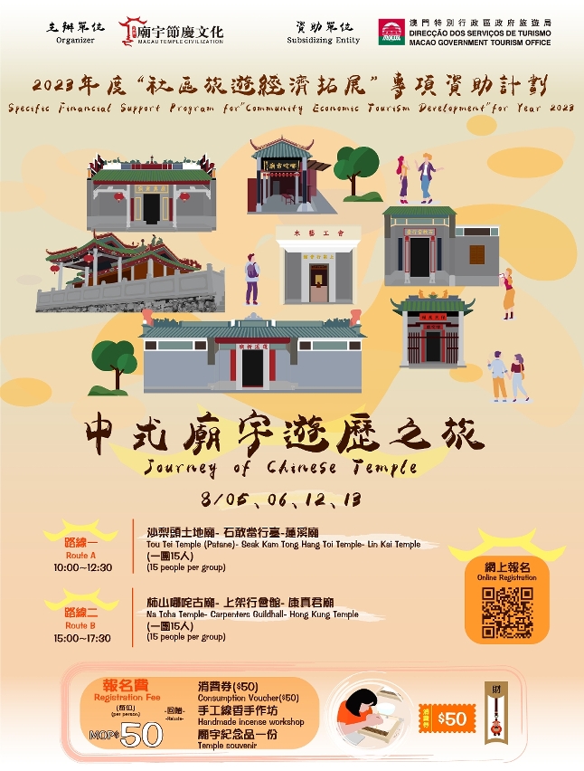 Nos sábados e domingos de 5, 6, 12 e 13 de Agosto, realizar-se-ão os “Passeios Históricos pelos Templos Chineses”, num total de oito sessões, na parte da manhã e da tarde. A actividade divide-se em dois roteiros para levar os participantes numa viagem aos templos chineses, a fim de conhecer a história, a cultura e os recursos turísticos dos templos e das comunidades circundantes. Itinerário 1: Templo de Tou Tei do Patane – Pagode de Seak Kam Tong Hang Toi – Templo de Lin Kai; itinerário 2: Templo de Na Tcha na Calçada das Verdades - Templo de Kun Iam - Templo de Hong Chan Kuan. Os participantes além de experienciar também num workshop a arte da manufactura de incenso artesanal, terão ainda direito a cupões de consumo e lembranças.