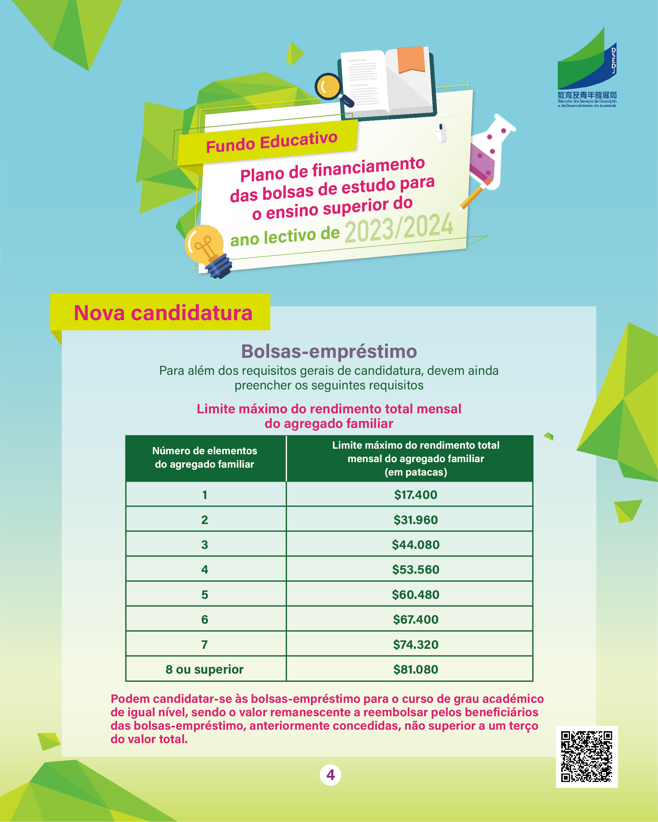 Para mais informações, podem consultar a página electrónica temática do “Plano das Bolsas de Estudo para o Ensino Superior”, em https://portal.dsedj.gov.mo/webdsejspace/internet/Inter_main_page.jsp?id=8744&langsel=P