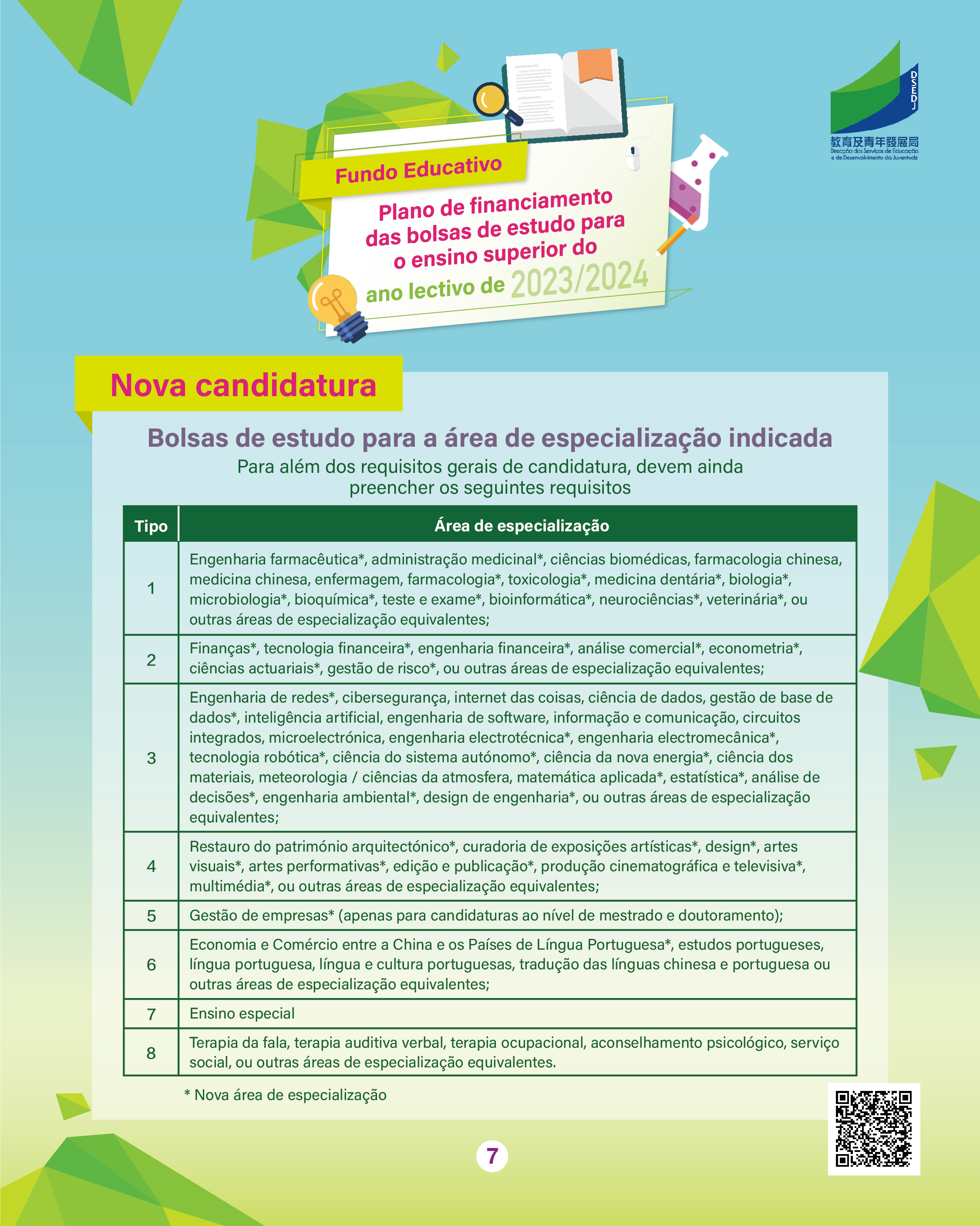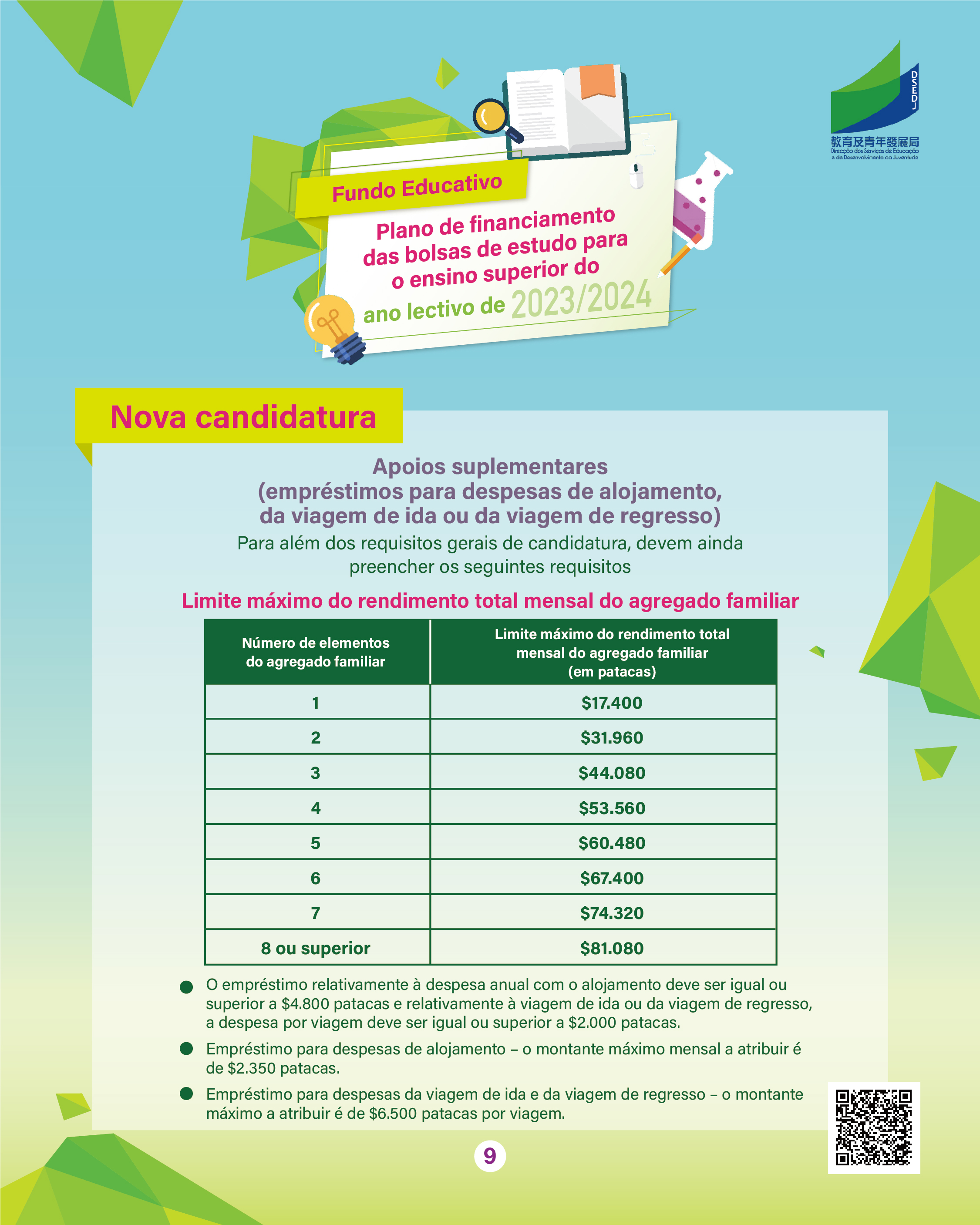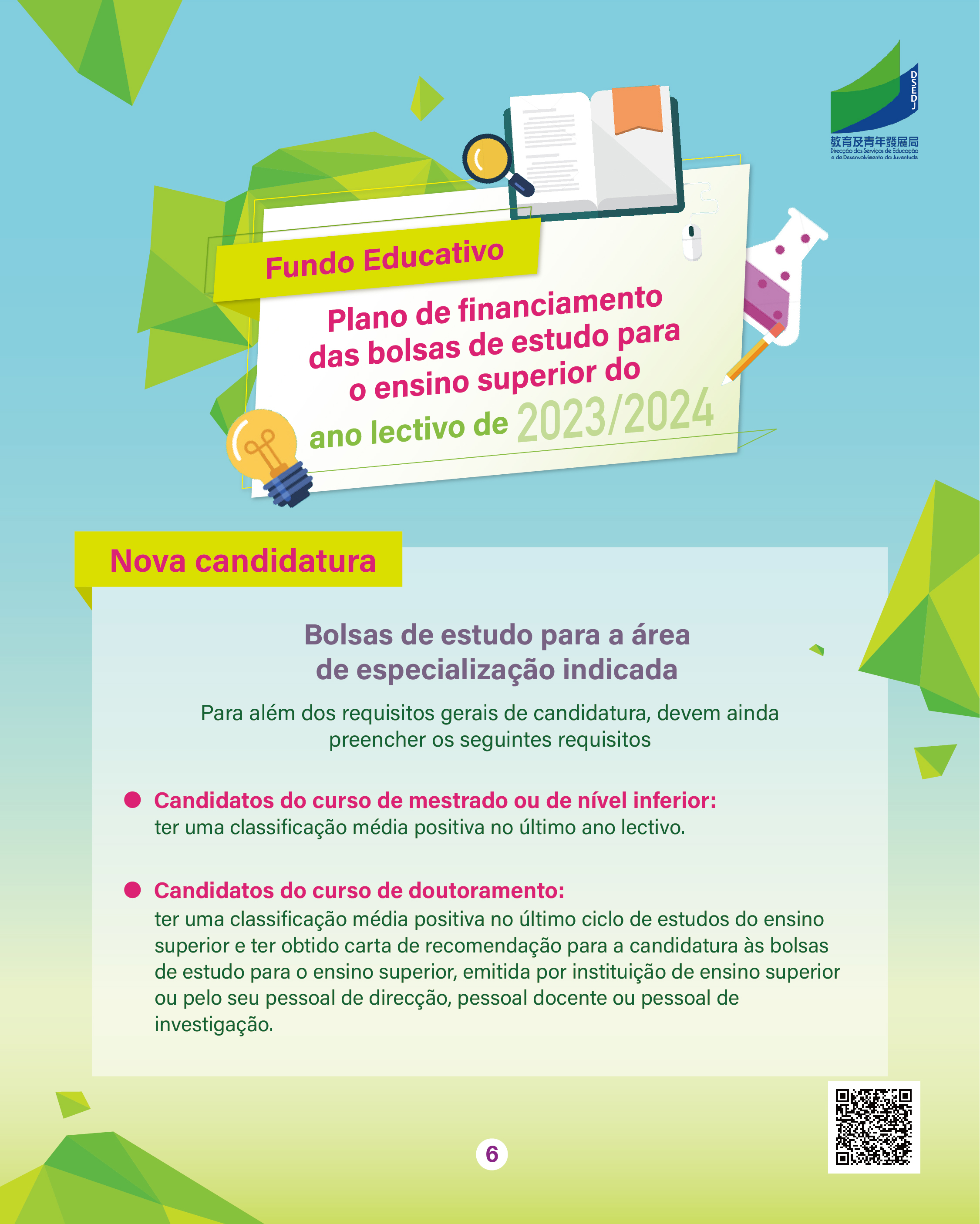 O prazo de candidatura do ano lectivo de 2023/2024 para o “Plano das Bolsas de Estudo para o Ensino Superior” do Fundo Educativo, doravante designado por “Plano”, decorre entre 7 a 25 de Agosto de 2023.