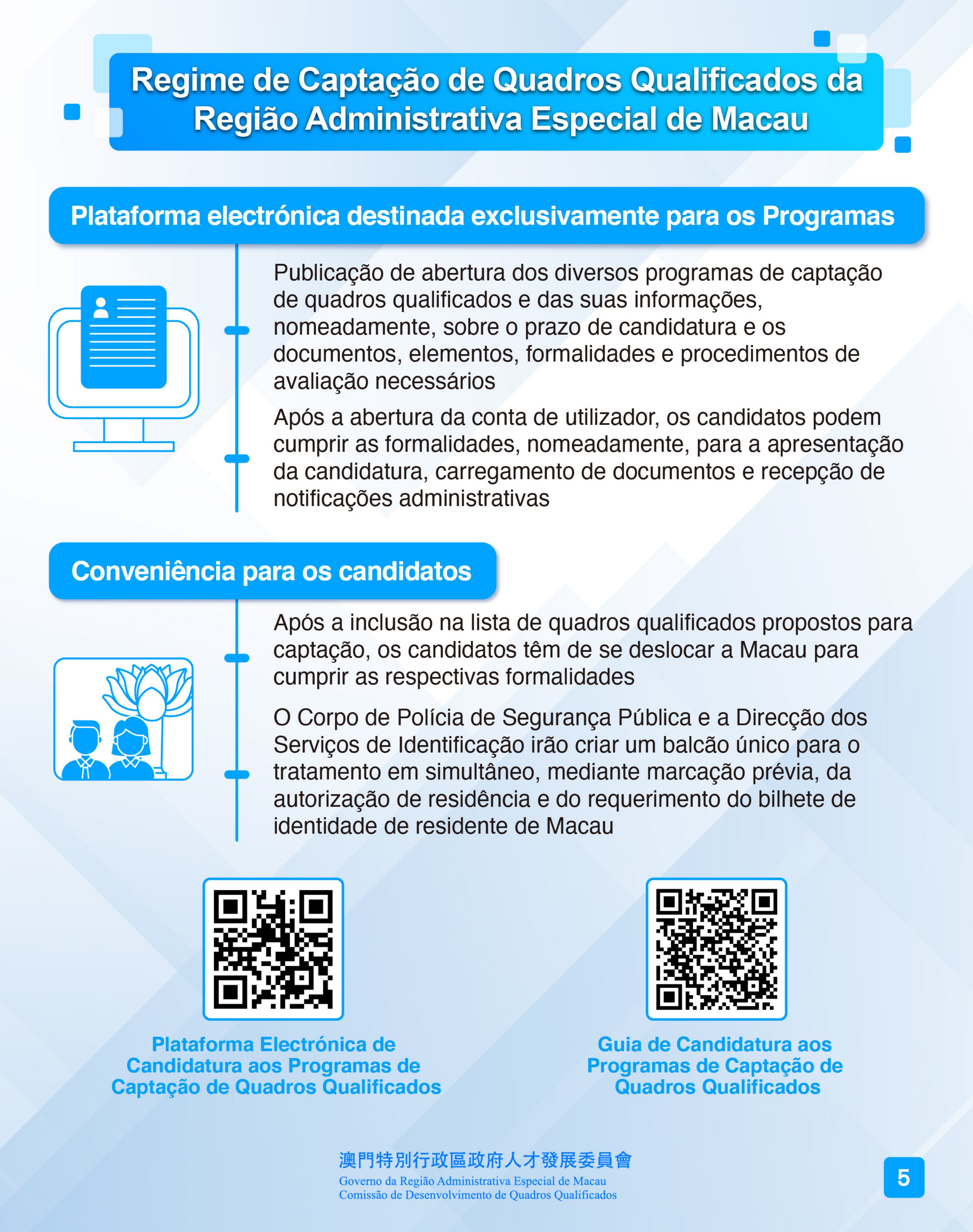 Na Plataforma Electrónica de Candidatura aos Programas de Captação de Quadros Qualificados, serão publicados anúncios dos diversos programas de captação de quadros qualificados e o Guia de Candidatura aos Programas de Captação de Quadros Qualificados, onde estão disponíveis as informações, nomeadamente, sobre os documentos, elementos e procedimentos necessários para a candidatura e os critérios de avaliação aplicáveis. Após a abertura da conta de utilizador na plataforma electrónica, os candidatos podem cumprir as formalidades, nomeadamente, para a apresentação da candidatura, carregamento de documentos e recepção de notificações administrativas.