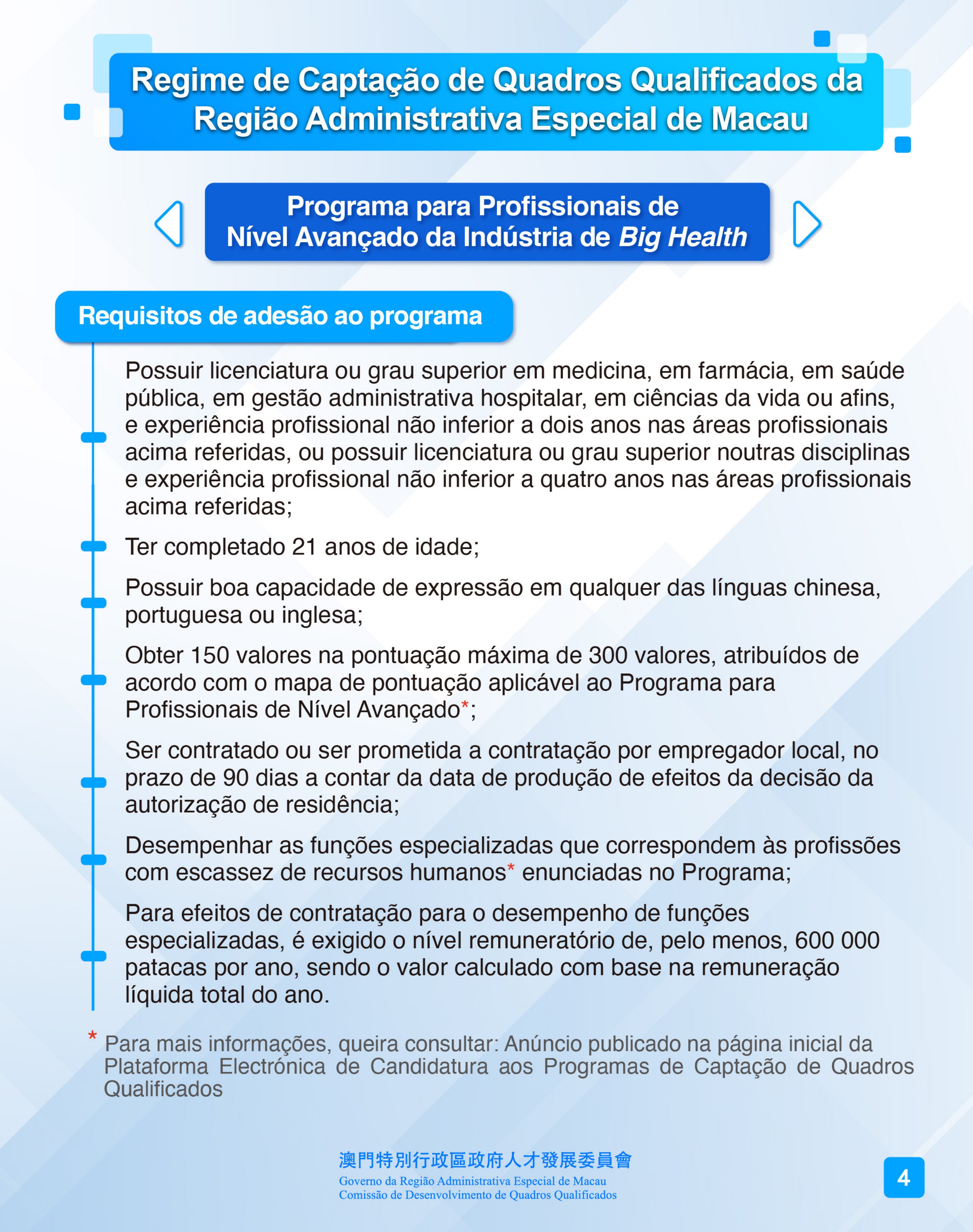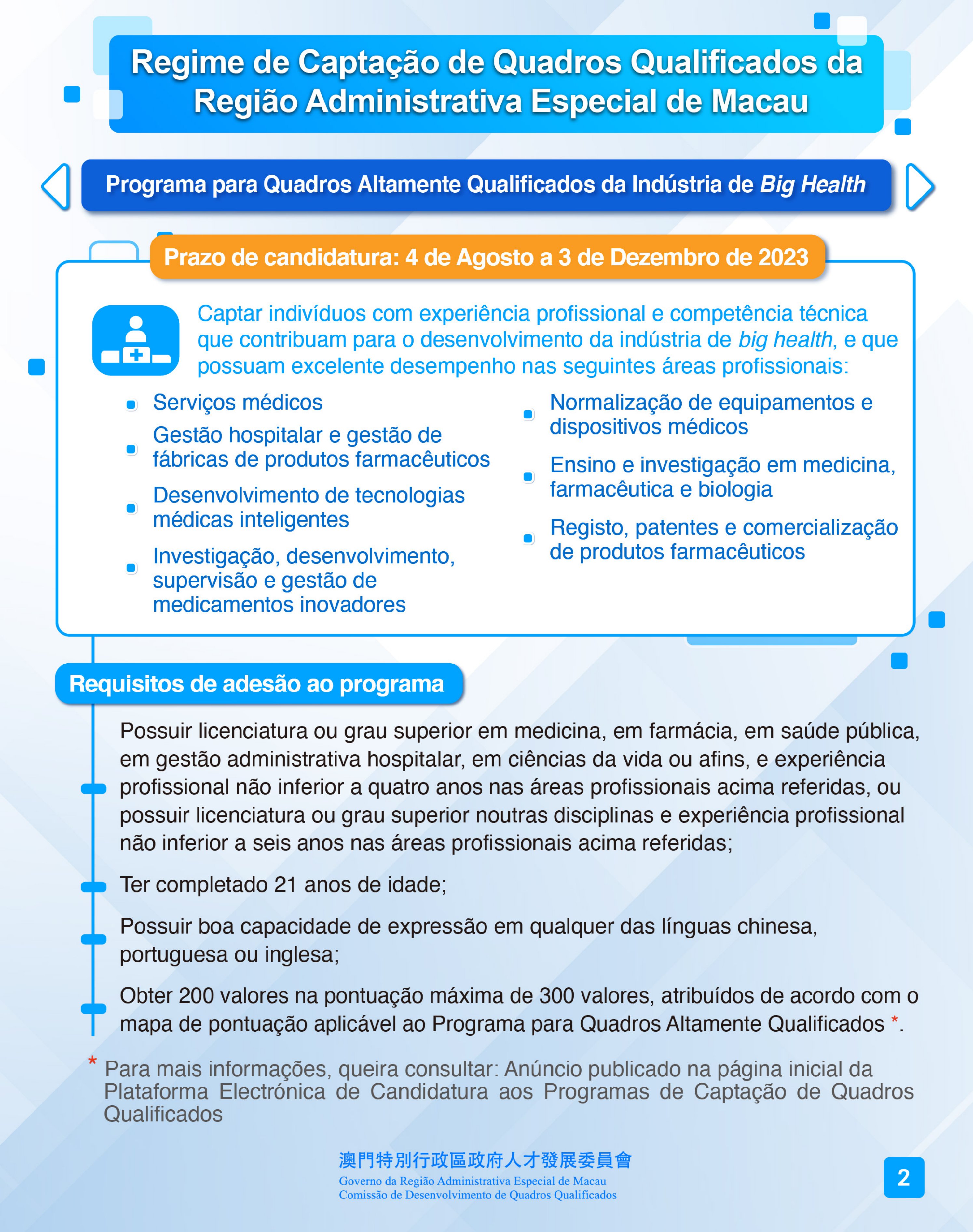 De 4 de Agosto a 3 de Dezembro de 2023, encontra-se aberto o período de candidaturas ao Programa para Profissionais de Nível Avançado da Indústria de Big Health, que visa captar indivíduos com experiência profissional e competência técnica que contribuam para o desenvolvimento da indústria de big health, nas seguintes áreas profissionais: 1) serviços médicos; 2) gestão hospitalar e gestão de fábricas de produtos farmacêuticos; 3) desenvolvimento de tecnologias médicas inteligentes; 4) investigação, desenvolvimento, supervisão e gestão de medicamentos inovadores; 5) normalização de equipamentos e dispositivos médicos; 6) ensino e investigação em medicina, farmacêutica e biologia; 7) registo, patentes e comercialização de produtos farmacêuticos. Os candidatos têm de preencher, cumulativamente, os seguintes requisitos: possuir licenciatura ou grau superior em medicina, em farmácia, em saúde pública, em gestão administrativa hospitalar, em ciências da vida ou afins, e experiência profissional não inferior a dois anos nas áreas profissionais acima referidas, ou possuir licenciatura ou grau superior noutras disciplinas e experiência profissional não inferior a quatro anos nas áreas profissionais acima referidas; ter completado 21 anos de idade; possuir boa capacidade de expressão em qualquer das línguas chinesa, portuguesa ou inglesa; obter 150 valores na pontuação máxima de 300 valores, atribuídos de acordo com o mapa de pontuação aplicável ao programa; ser contratado ou ser prometida a contratação por empregador local, no prazo de 90 dias a contar da data de produção de efeitos da decisão da autorização de residência, para o desempenho de funções especializadas que correspondem às profissões com escassez de recursos humanos definidas no programa, sendo exigido, para o efeito, o nível remuneratório de, pelo menos, 600 000 patacas por ano.