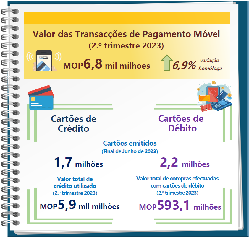 No segundo trimestre de 2023, o crédito utilizado no período atingiu MOP5,9 mil milhões, o que representou um acréscimo de 16,2% relativamente ao ano anterior. O adiantamento de numerário atingiu MOP159,6 milhões, correspondendo a 2,7% do total do crédito utilizado no período. O número de transacções realizadas com cartões de crédito totalizou 9,1 milhões, o que representou um créscimo de 8,3% face ao ano anterior. O montante do reembolso, incluindo os juros e despesas, foi de MOP5,8 mil milhões, o que representou um aumento de 7,2% relativamente ao ano anterior. Além disso, o número de transacções realizadas com cartões de débito (não incluindo o levantamento de numerário) totalizou 349,8 mil. O valor total de compras efectuadas com cartões de débito foi de MOP593,1 milhões.