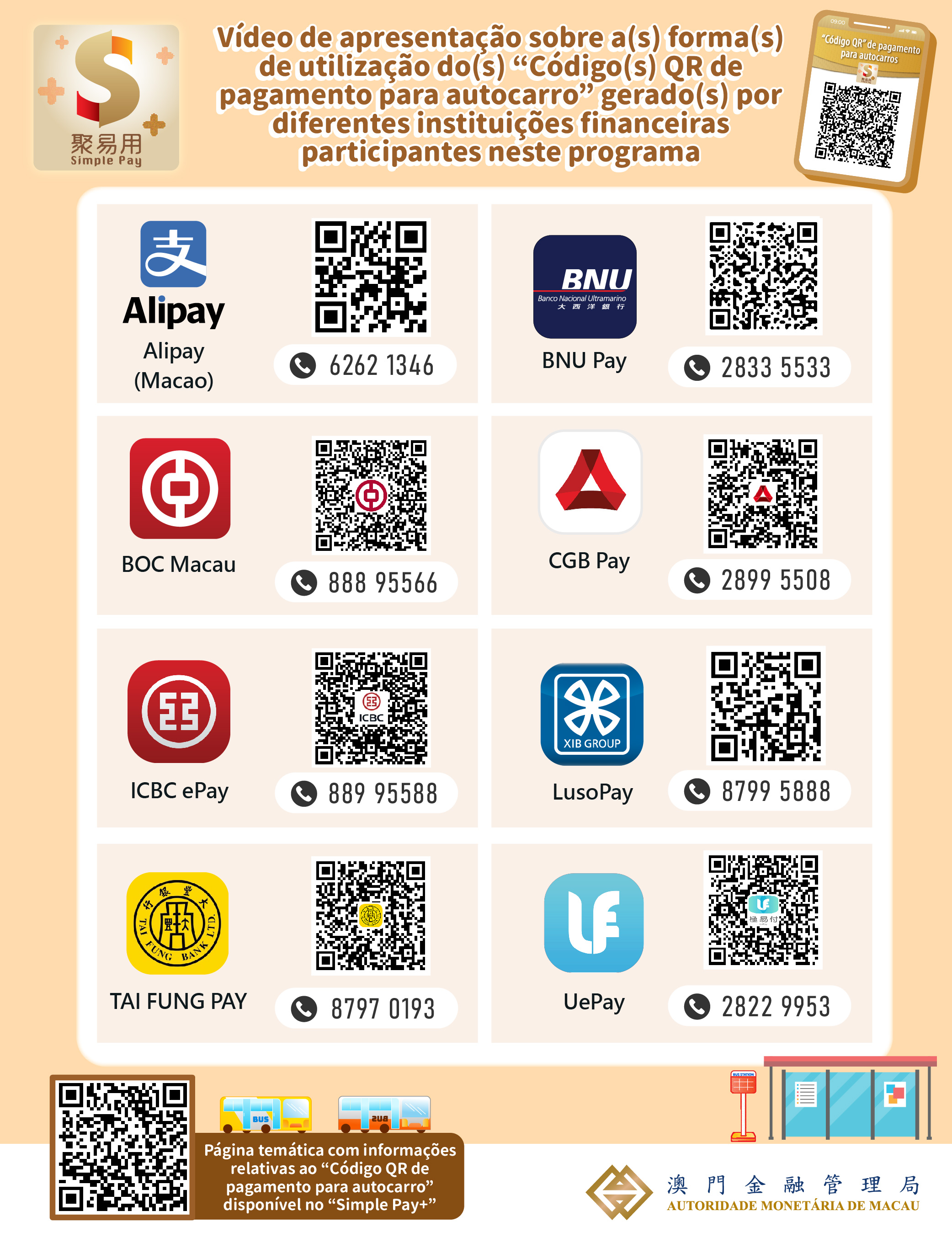 Com vista a promover a inovação dos pagamentos móveis e a responder às solicitações manifestadas pela sociedade em geral e, na sequência da coordenação da Autoridade Monetária de Macau (AMCM), os clientes das instituições financeiras locais que paguem as tarifas de autocarro, utilizando o “Código QR de pagamento para autocarros” gerado por quaisquer meios de pagamento integrados no “Simple Pay+”, nomeadamente, o Alipay Macau, o BOC Mobile Banking Macau, o Guangfa Mobile Payment Wallet, o ICBC ePay, o LusoPay, o MPay, o Tai FungPay, o UePay Macau E-Wallet e o BNU Pay, podem usufruir, a partir de hoje (dia 11), dos benefícios em vigor, designadamente dos benefícios de tarifas e dos benefícios de correspondência de carreiras (excluindo os benefícios concedidos aos idosos, às pessoas com deficiência e aos estudantes), sendo que a sinalização “Simple Pay +” será exibida sucessivamente nas aplicações dos meios de pagamento e afixada em local visível na caixa de pagamento (de tarifas) dos autocarros.