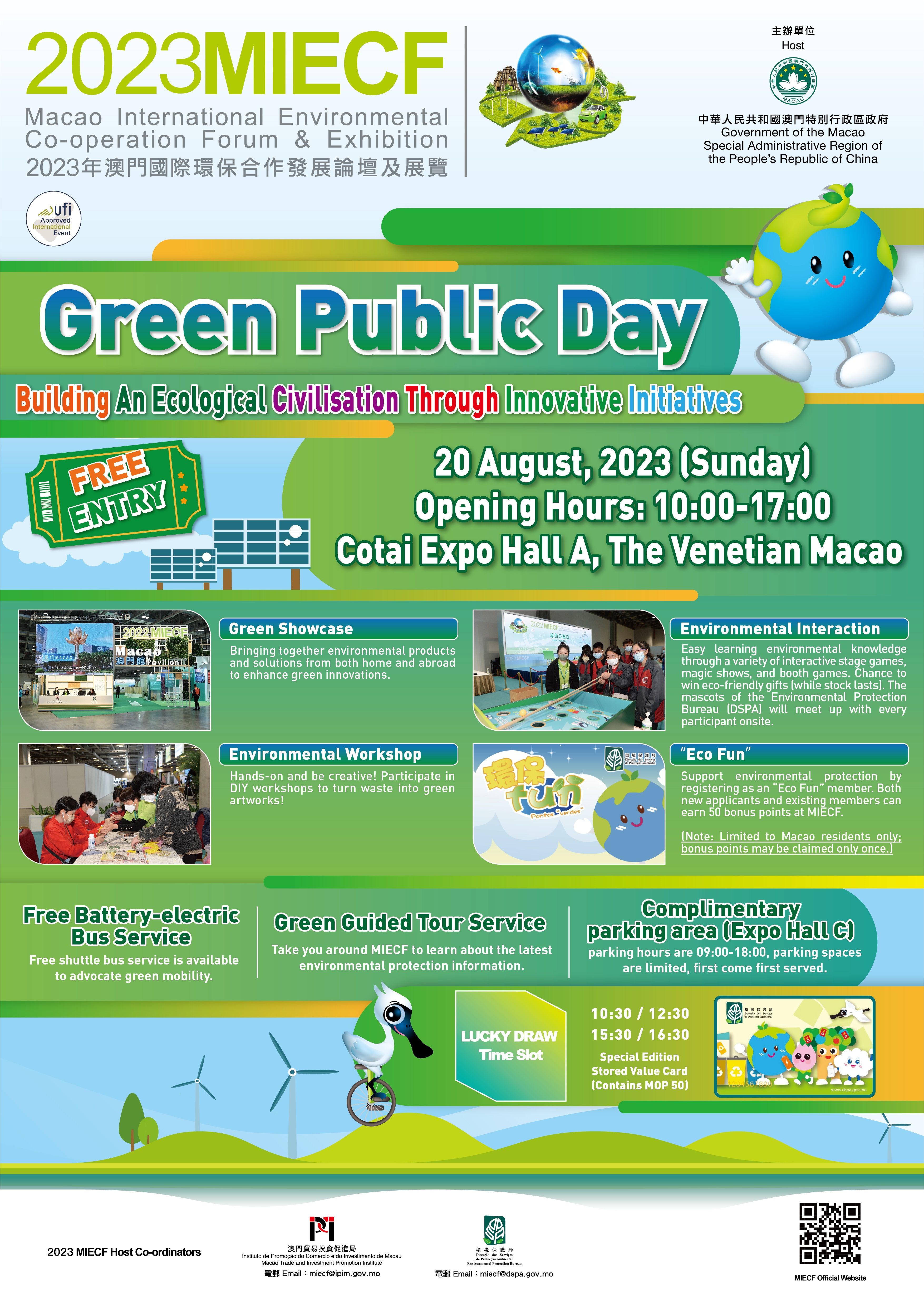 De modo a incentivar a prática da deslocação ecológica, no “Dia Verde do Público” a entidade organizadora disponibilizará um serviço de transporte gratuito com 4 carreiras de autocarros eléctricos a circular entre a zona central, a zona norte, a Taipa e o recinto do MIECF. O horário de abertura da zona de actividades de protecção ambiental é das 10h00 às 17h00.