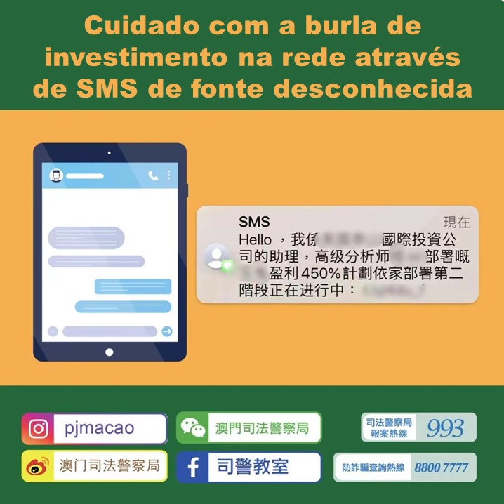 A Polícia Judiciária (PJ) descobriu recentemente mensagens de texto SMS enviados por burlões que dizem ser técnicos analistas de uma empresa de investimentos, e que têm um projecto de investimento onde se pode ganhar muito dinheiro. Depois de despertarem o interesse das pessoas, os burlões pedem-lhes para clicarem num link indicado na mensagem para terem um contacto com outro programa de comunicação do telemóvel.