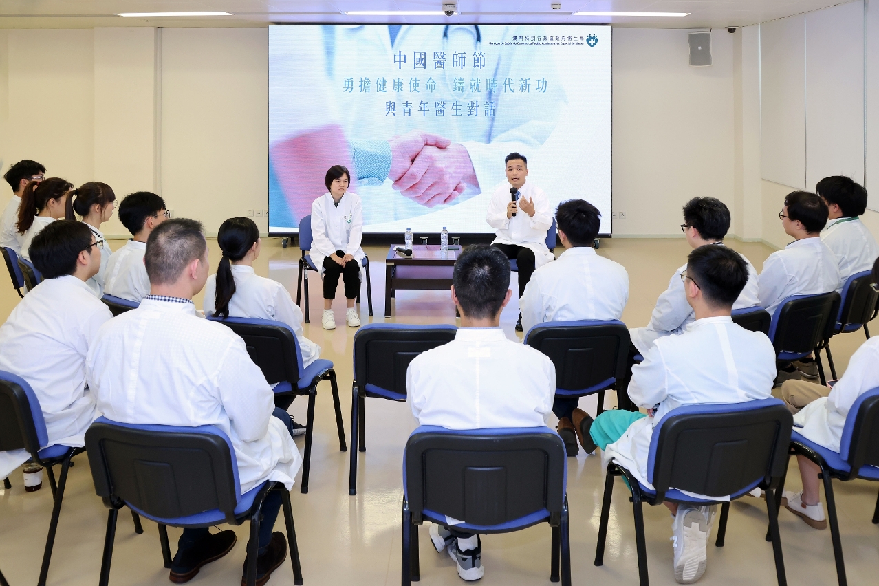 A par disso, o Director dos Serviços de Saúde, Dr. Lo Iek Long, e a Coordenadora da Academia Médica de Macau, Drª. Lam Kuo, tiveram um intercâmbio com vários jovens médicos que se encontram em curso de formação. O Dr. Lo Iek Long, manifestou o seu agradecimento a todos os profissionais de saúde pelos esforços envidados ao longo dos anos. Sublinhou que os jovens médicos são um suporte indispensável de recurso humano no desenvolvimento do sector de saúde e, mediante o Dia de Médico Chinês, para além de manifestar o respeito e agradecimento a cada médico, a auscultação das opiniões dos jovens médicos também foi uma etapa importante, esperando que, através desta sessão de intercâmbio, possam conhecer os seus pontos de vista e sugestões, bem como as dificuldades e desafios encontrados no trabalho de saúde, entre outros, com vista a organizar melhor o rumo de desenvolvimento do sector de saúde. O mesmo responsável espera que, os jovens médicos possam seguir as boas tradições, progredir com coragem na medicina, elevar constantemente o nível das técnicas médicas e a qualidade dos serviços, envidar novos contributos para salvaguardar e assegurar a saúde de residentes e mostrar a forma que os jovens devem ter na nova era.