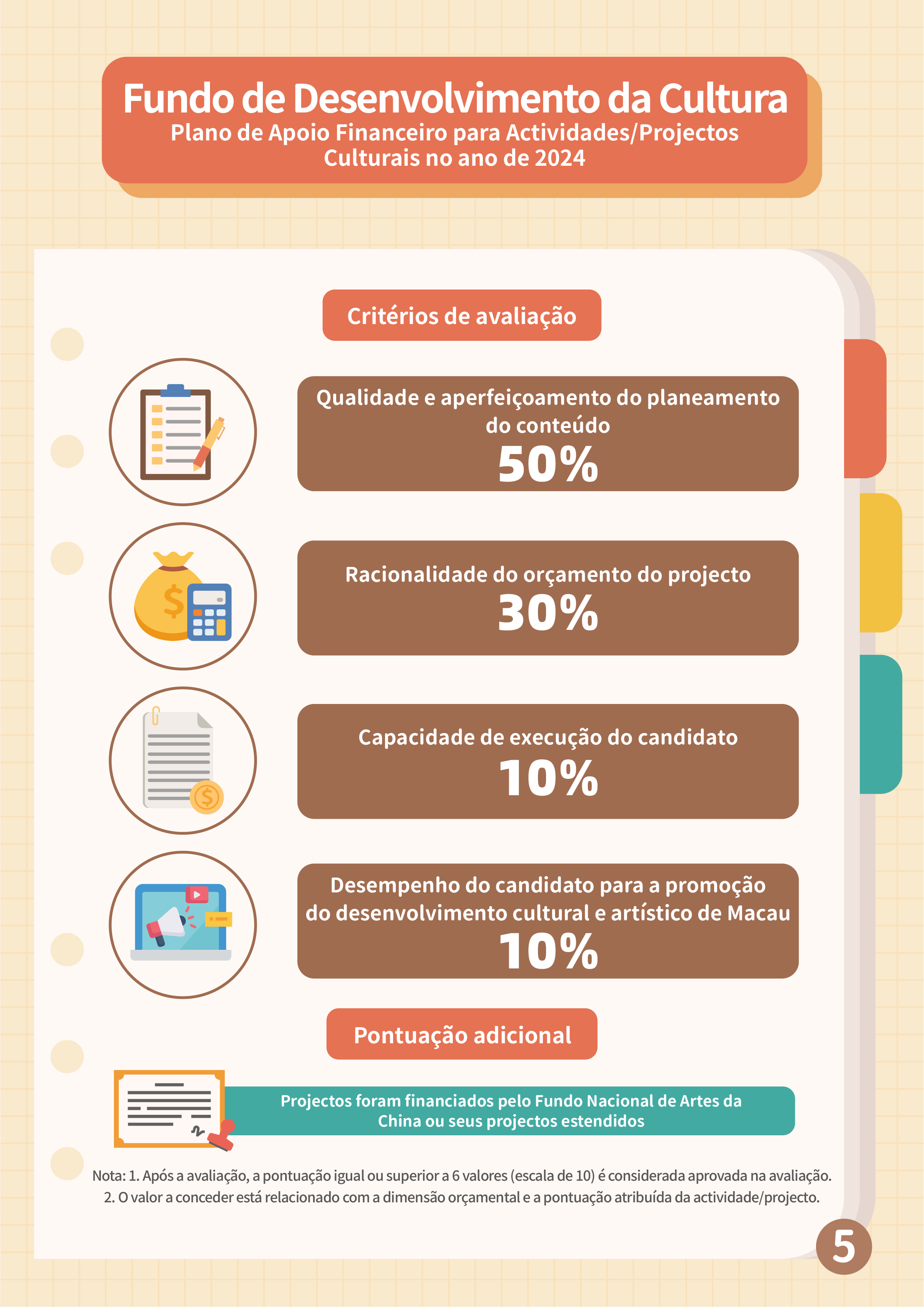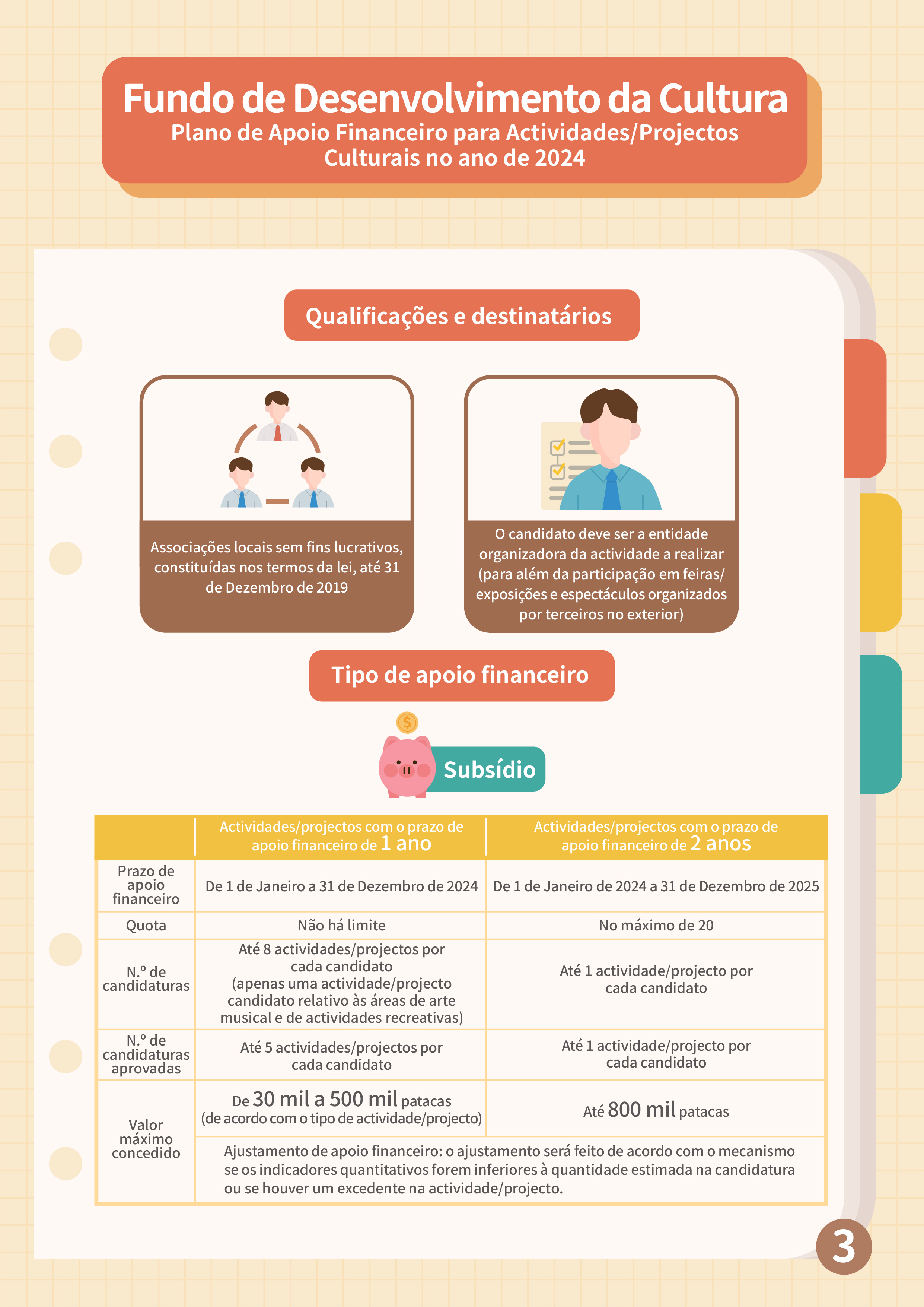O “Plano de apoio financeiro para actividades/projectos culturais no ano de 2024” visa apoiar as associações sem fins lucrativos locais, constituídas nos termos da lei, a desenvolverem os diversos trabalhos de criação artística e cultural e respectivas promoções, de conservação da história e cultura locais, bem como, o intercâmbio cultural e artístico local, sendo o período de candidaturas de 1 a 25 de Setembro. Os âmbitos de apoio financeiro incluem: actividades/projectos relacionados com as artes visuais, criação literária, música, arte musical (incluindo diálogo musical, destaques de óperas, apenas sob a forma de actuações) e actividades recreactivas (canções clássicas e populares, apenas sob a forma de actuações), teatro, dança, património cultural tangível, património cultural intangível (incluindo óperas cantonesas), moda, design, cinema e televisão, animação. Neste plano, integra-se ainda o anterior “Plano de Apoio Financeiro para Actividades/Projectos Culturais Plurianuais”. Os candidatos podem apresentar actividades/projectos candidatos para o prazo de execução de 1 ano ou 2 anos, devendo aceder ao Sistema de Candidatura Online do FDC, através da “Conta Única de Macau”, para preencher o boletim de candidatura, carregar os documentos necessários, e apresentar a candidatura online. O FDC relembra que as associações que pretendam candidatar-se ao plano, mas que ainda não tenham criado a Conta Única (entidades), devem proceder às formalidades da abertura de conta junto dos Serviços de Administração e Função Pública (SAFP) com a maior brevidade possível, para a activação da Conta, enquanto que o SAFP responderá sobre o resultado do pedido relevante no prazo de 15 dias úteis contados a partir do dia seguinte da recepção de documentos do pedido completos e qualificados.