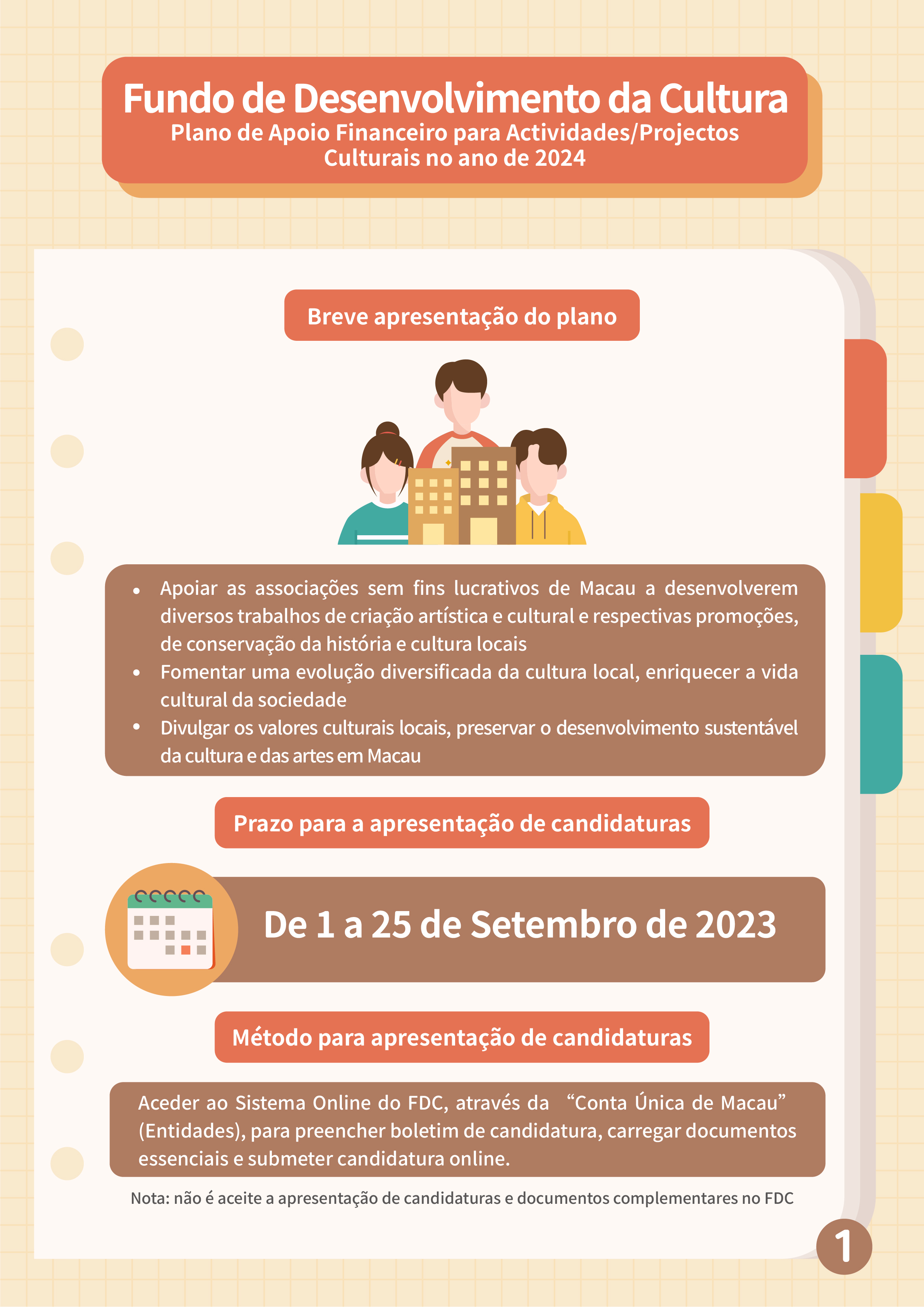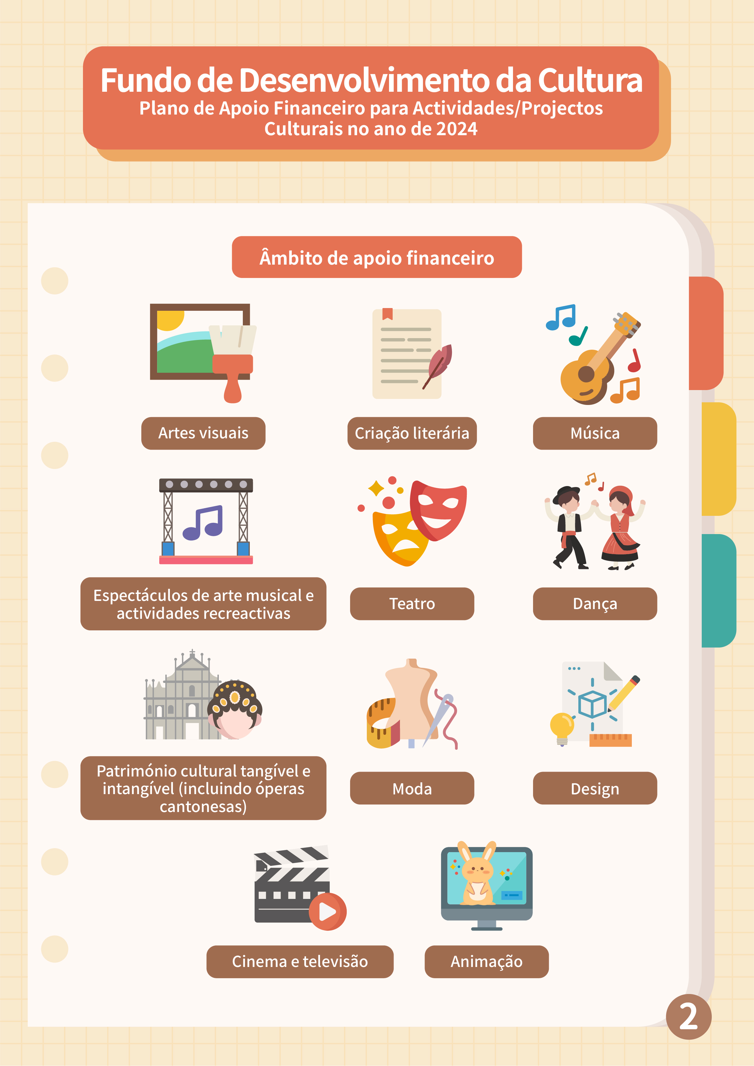 O Fundo de Desenvolvimento da Cultura (FDC) lança o “Plano de apoio financeiro para actividades/projectos culturais no ano de 2024” e o “11.º Plano de subsídio à criação de amostras de design de moda”, com vista a enriquecer a atmosfera cultural dos bairros comunitários e promover o desenvolvimento da indústria de design de moda em Macau.