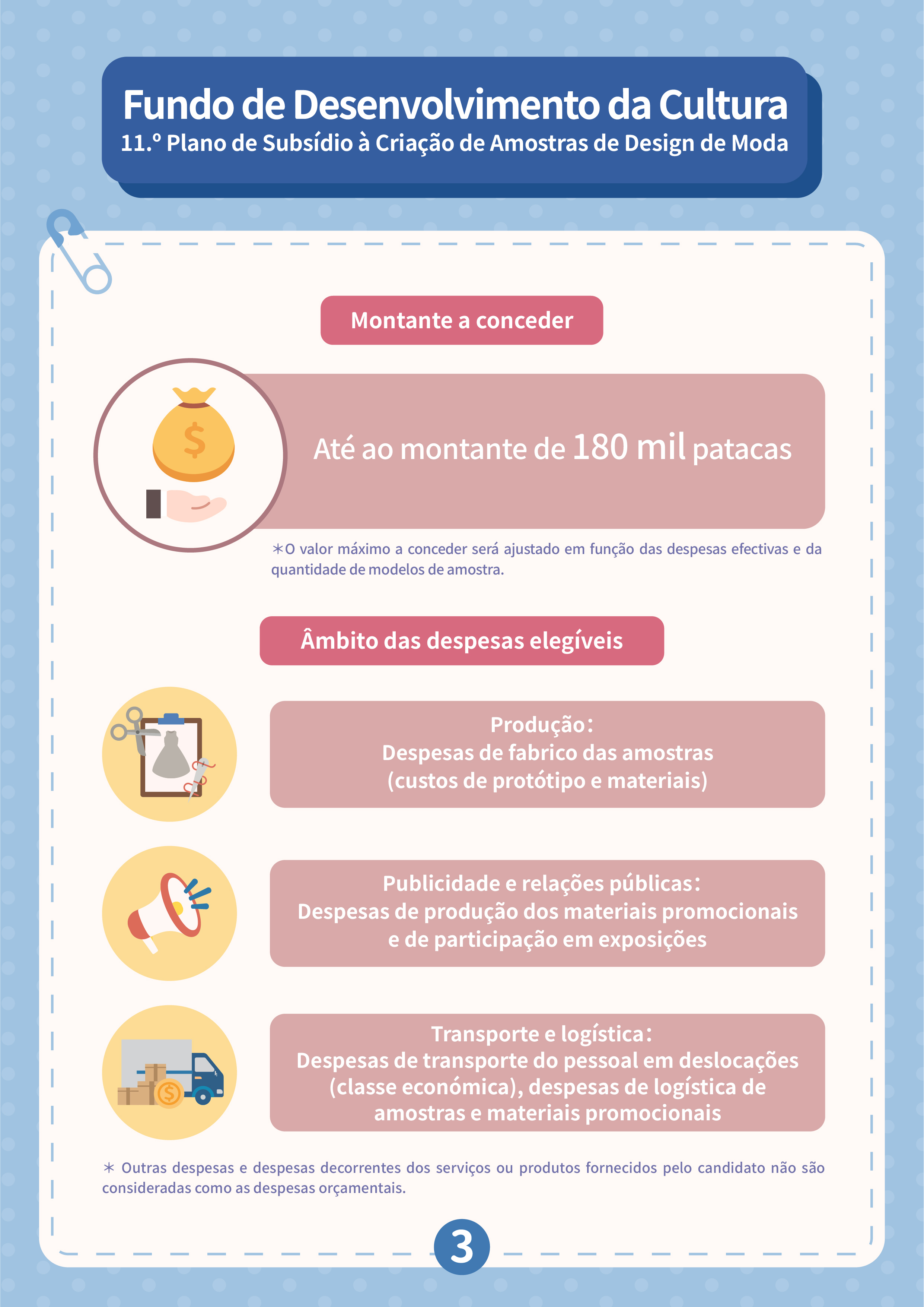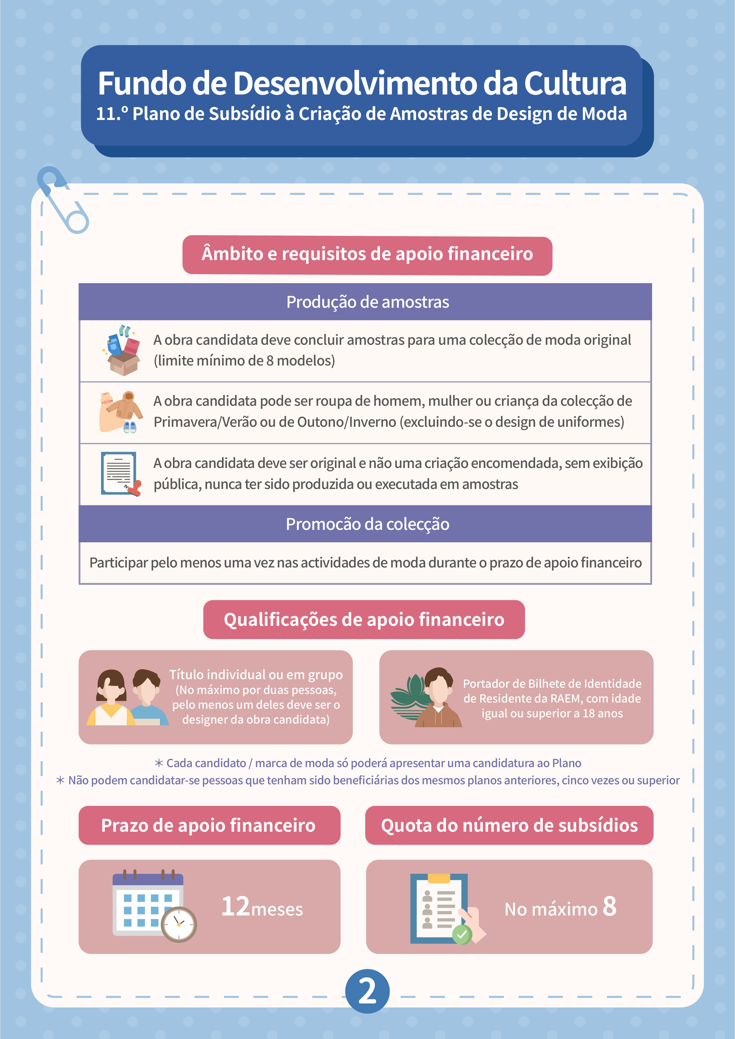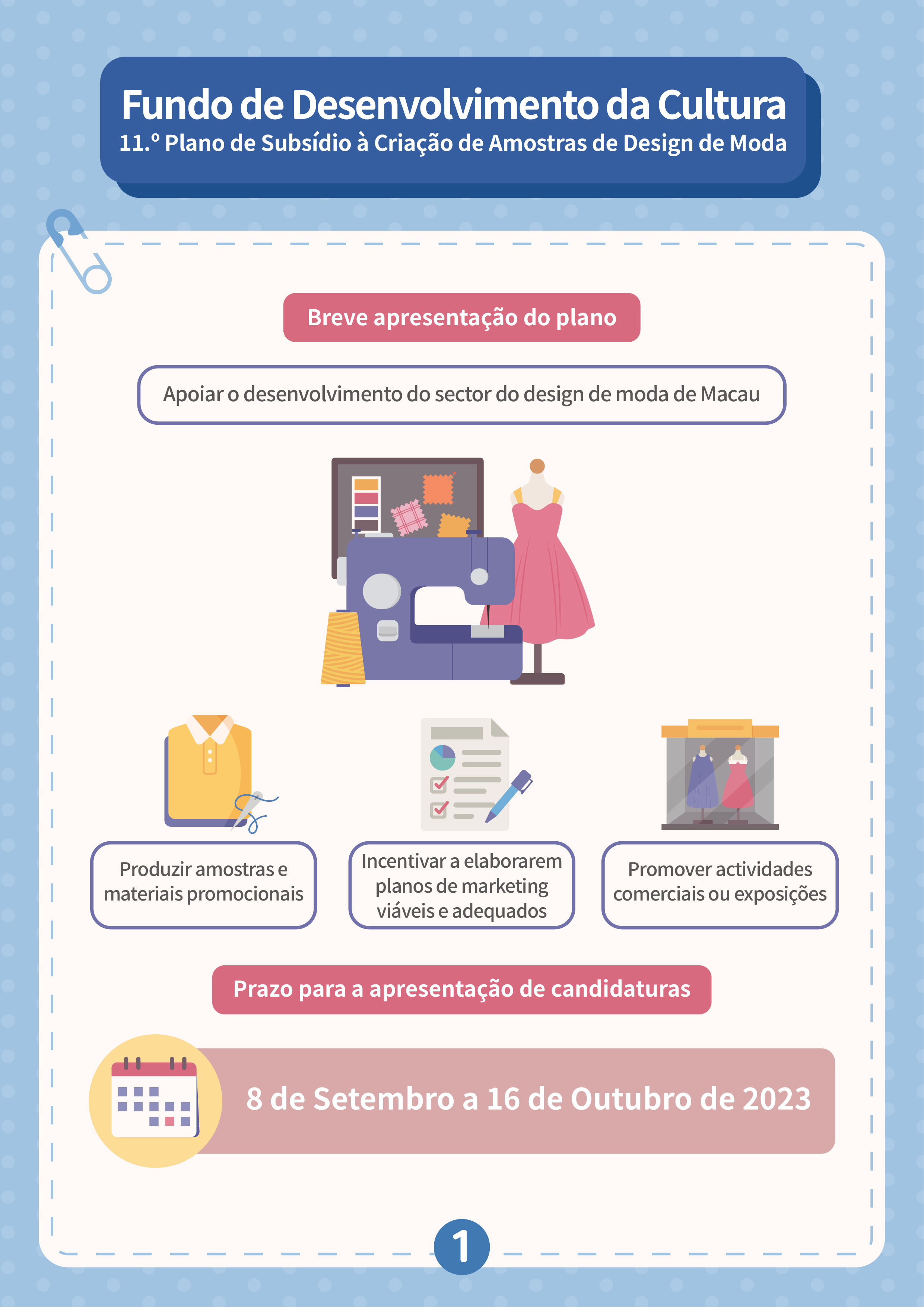 De 8 de Setembro a 16 de Outubro, serão aceites candidaturas ao “11.º Plano de subsídio à criação de amostras de design de moda”, com vista a incentivar a investigação e desenvolvimento inovadores do design de moda local, impulsionar os designers a definir planos de marketing viáveis e promover o desenvolvimento de actividades comerciais ou a participação em exposições de moda de Macau e do exterior, aumentando assim a sua visibilidade e competitividade nos mercados. Os candidatos podem apresentar candidatura a título individual ou em grupo, cujo número mínimo de obras candidatas é de 8 modelos. Os projectos financiados devem participar, pelo menos, uma vez nas actividades de moda durante o prazo de apoio financeiro. O processo de avaliação é composto pela Primeira Análise (avaliação documental) e Segunda Análise (sessão de perguntas e respostas no local). Os candidatos que procederão à Segunda Análise devem escolher um modelo para apresentar uma amostra de moda no local, sendo a quota máxima de subsídio de 8.